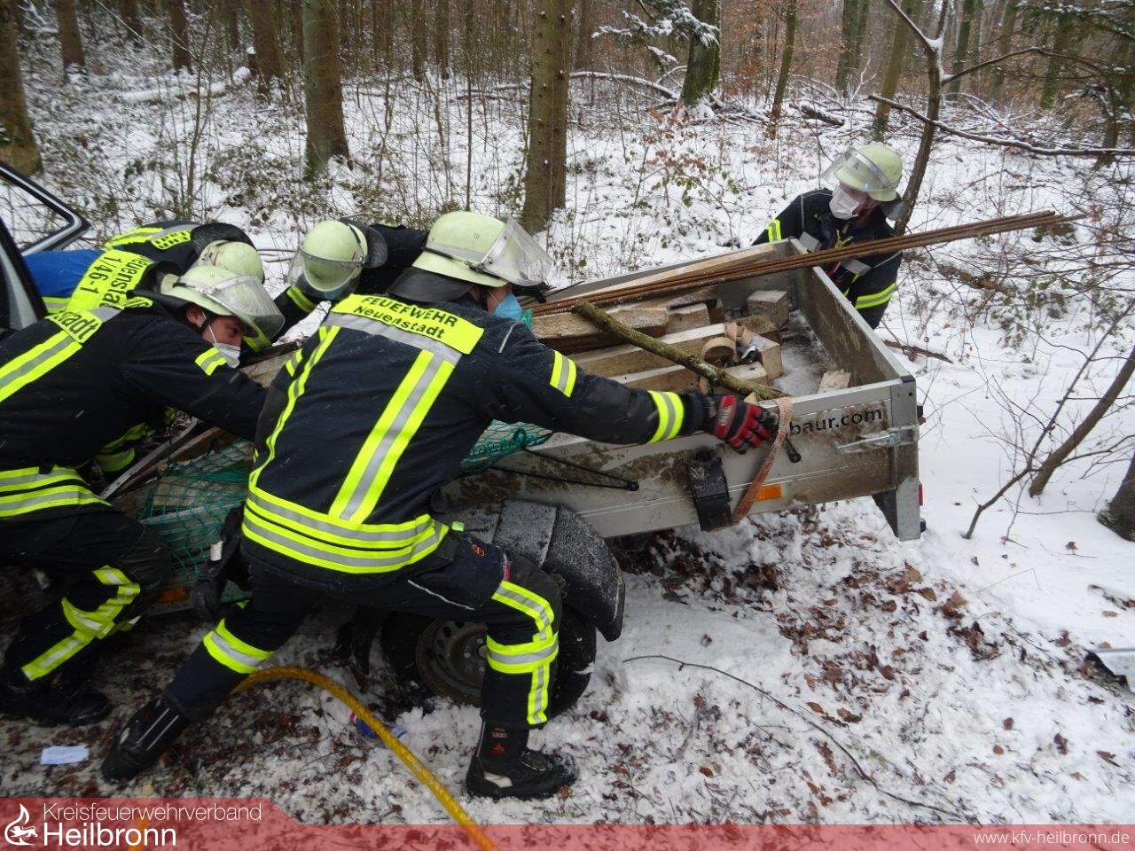Der Anhänger hatte sich beim Aufprall unter dem Fahrzeug verkeilt und versperrte den Zugang zum Fahrzeug, daher musste zunächst die Deichsel abgetrennt werden. Zur Rettung wurde die Beifahrertüre geöffnet und eine große Seitenöffnung durchgeführt. Dadurch konnte die verletzte Person liegend auf das Spineboard gebracht und patientengerecht transportiert und dem Rettungsdienst übergeben werden.