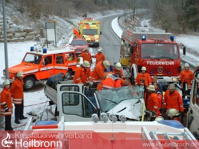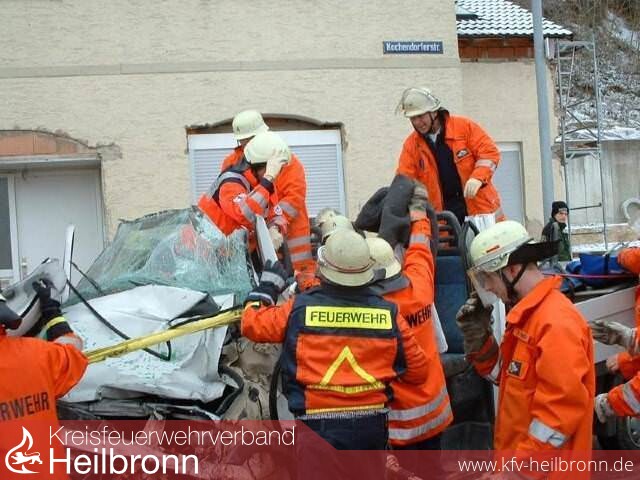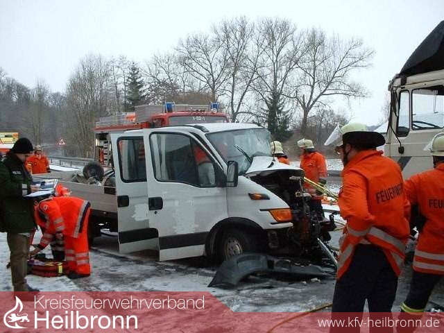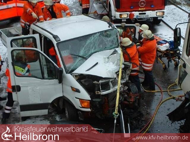In der Kochendorfer Straße war ein Kleintransporter mit einem LKW zusammengestoßen, wodurch der Fahrer des Kleintransporters in seinem Fahrzeug schwer eingeklemmt wurde.