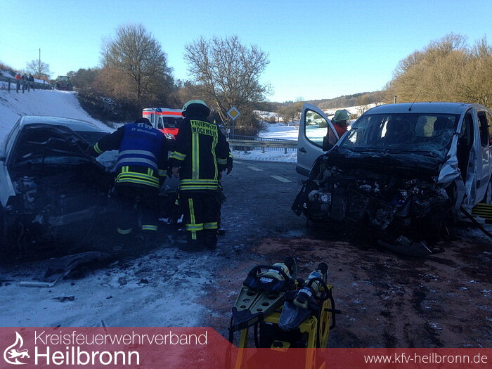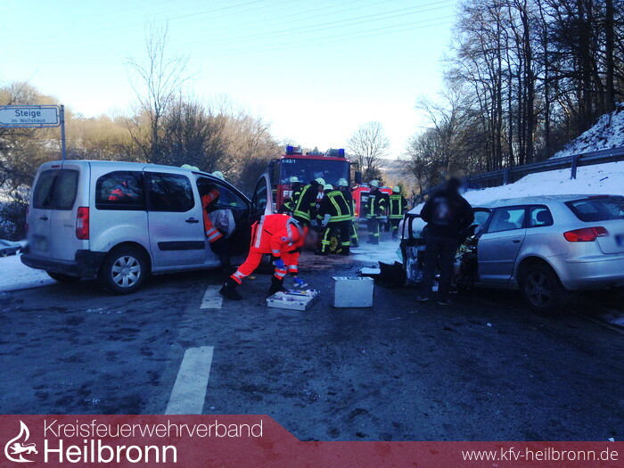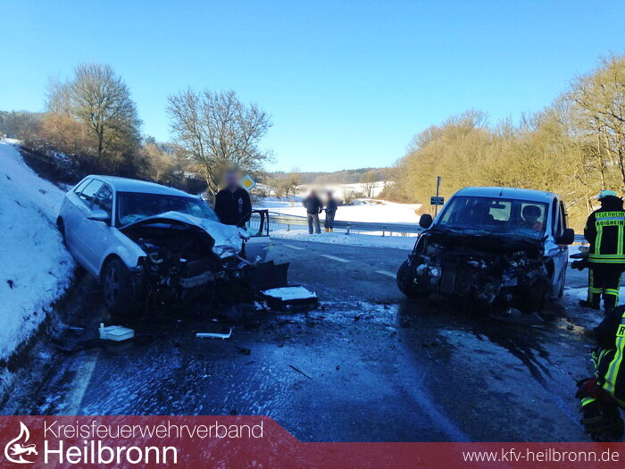 Zu einem Verkehrsunfall mit eingeklemmter Person wurden die beiden Feuerwehren aus Roigheim und Möckmühl auf die L 1099, Ortsausgang Roigheim in Richtung Schefflenz, gerufen. Auf Höhe der Abzweigung in das Wohngebiet Steige waren aus nicht geklärter Ursache zwei PKW miteinander kollidiert.