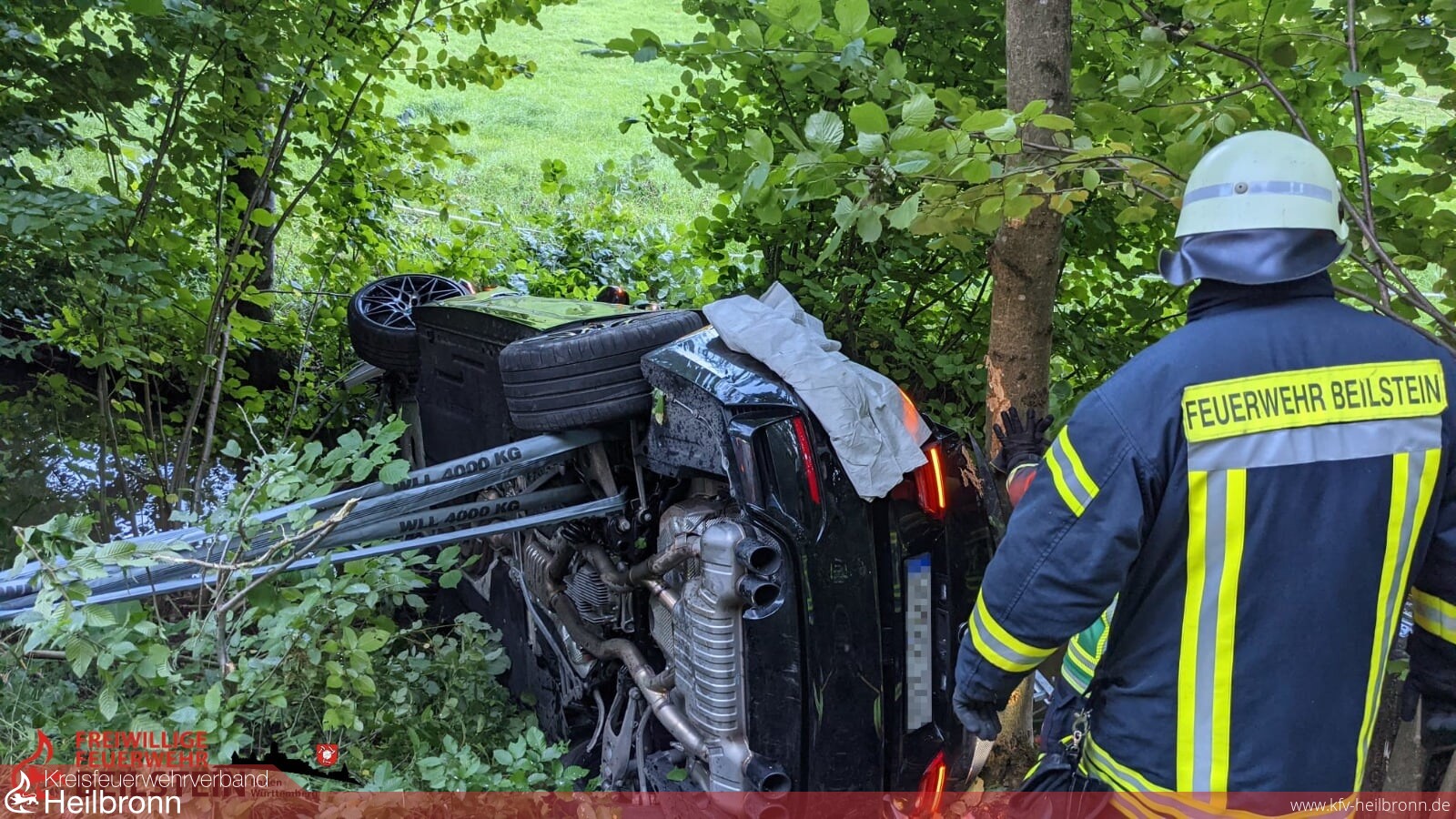 An der Einsatzstelle angekommen, zeigte sich den Einsatzkräften, dass ein PKW von der Landstraße abkam. Der PKW kam seitlich liegend im nahe vorbeifließenden Schmidbach zum Stillstand.