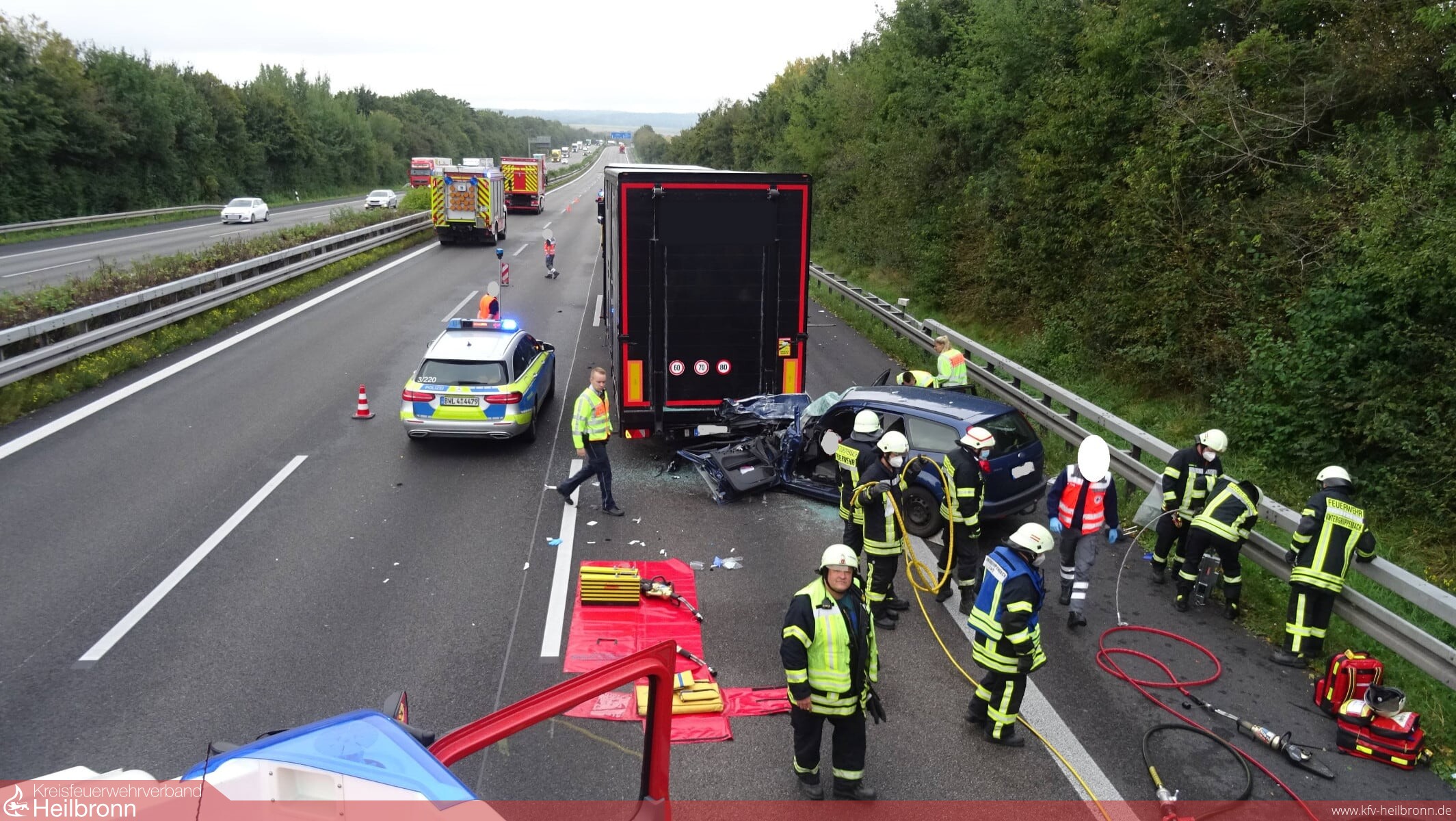 Beim Eintreffen der ersten Kräfte stellte sich die Lage so dar, dass ein PKW an einem Stauende nahezu ungebremst unter das Heck eines LKW-Gespanns gefahren war. Im Fahrzeug befand sich eine stark eingeklemmte Person, welche bereits von Ersthelfern versorgt wurde. In Abstimmung mit dem Notarzt wurde die Person mittels mehrerer hydraulischer Rettungsgeräte aus ihrem PKW befreit und dem Rettungsdienst übergeben. Für den Weitertransport wurde ein Rettungshubschauber eingesetzt.