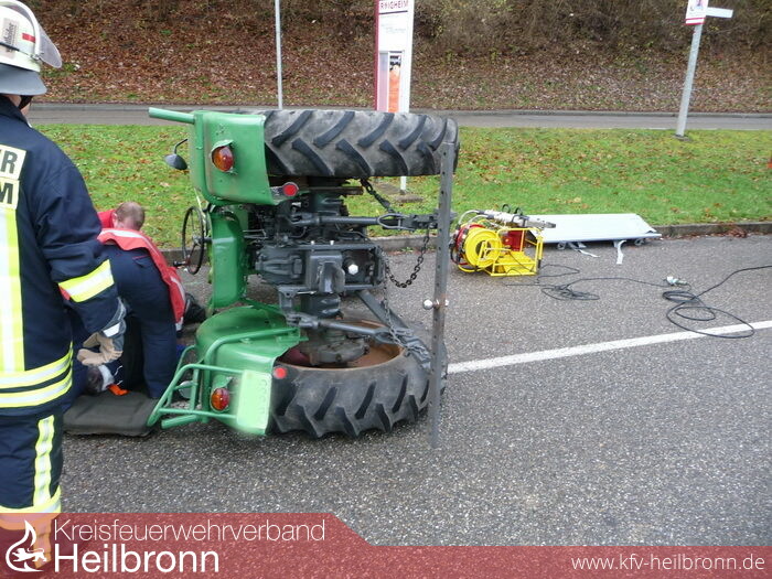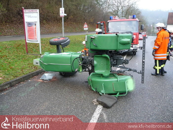 In der dortigen Ortseinfahrt war in einer sehr scharfen Kurve ein Schlepper ins Schleudern geraten und umgestürzt.