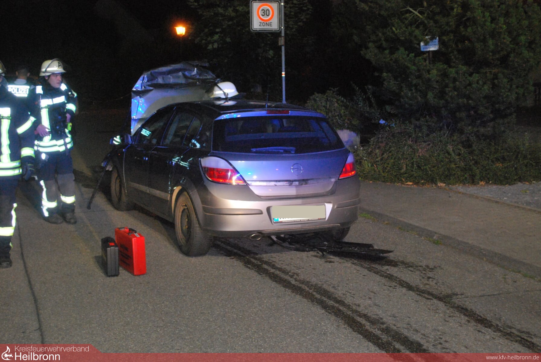 Die Feuerwehr Schwaigern war zu einem Fahrzeugbrand in die Gemminger Strasse alarmiert worden. Vor Ort fand sich ein gut 50 Meter langes Trümmerfeld. In der Paulinenstrasse stand ein verunfallter Opel, an dem Kühlmittel unter Dampfbildung austrat.