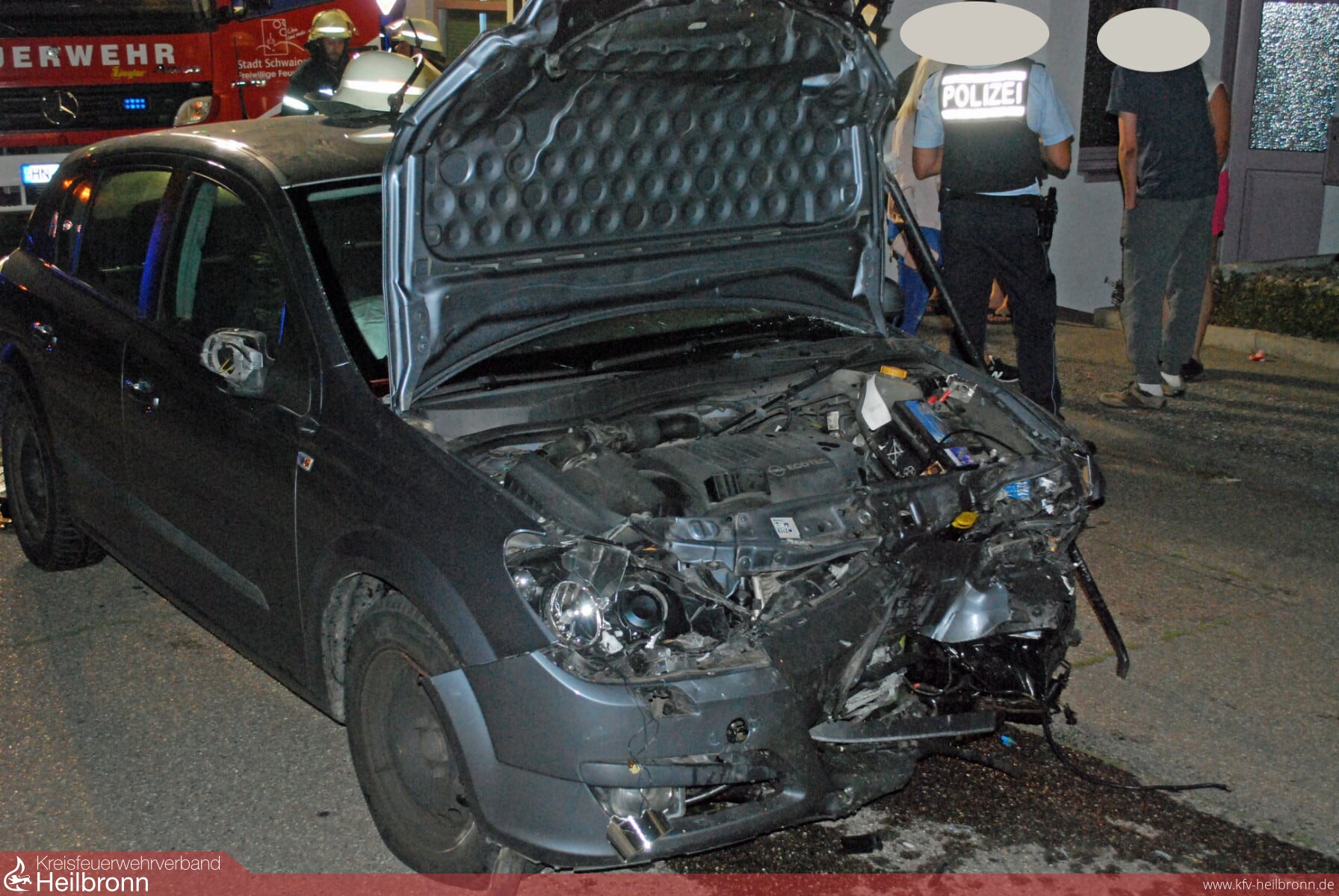Der Fahrer des PKW war bereits durch Passanten aus seinem demolierten Fahrzeug befreit worden. Ein weiterer beschädigter PKW stand in der Gemminger Strasse. Von der Feuerwehr wurden Sicherungsmaßnahmen an den Unfallfahrzeugen durchgeführt sowie der Brandschutz sichergestellt und die Unfallstelle ausgeleuchtet. Der Fahrer des Opel wurde vom Rettungsdienst ins Krankenhaus gebracht.