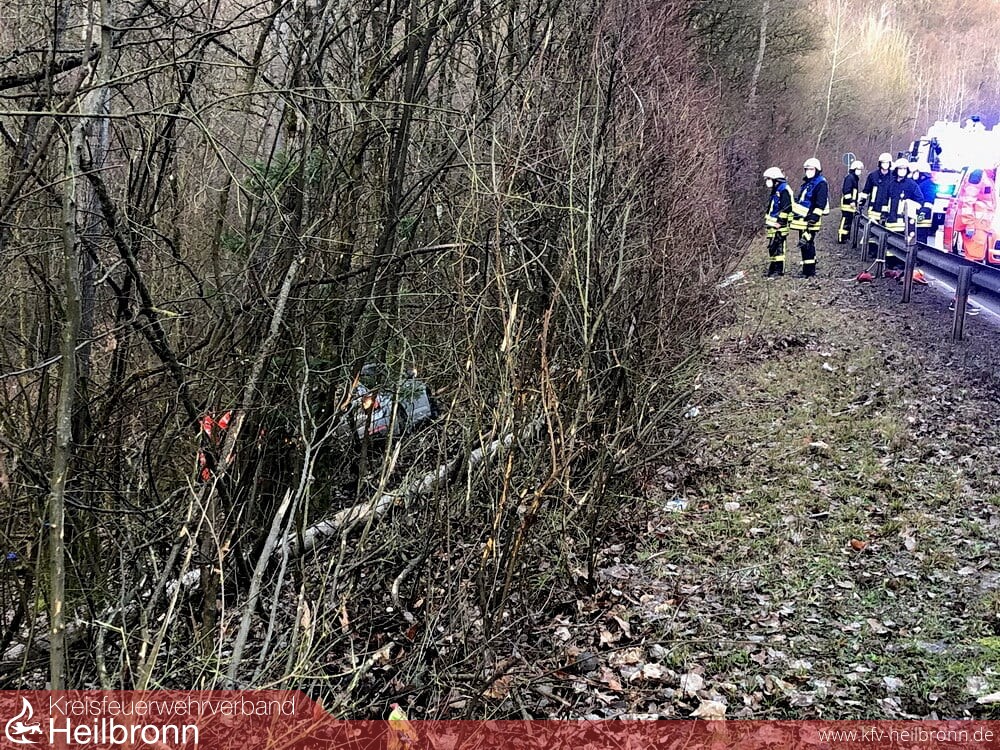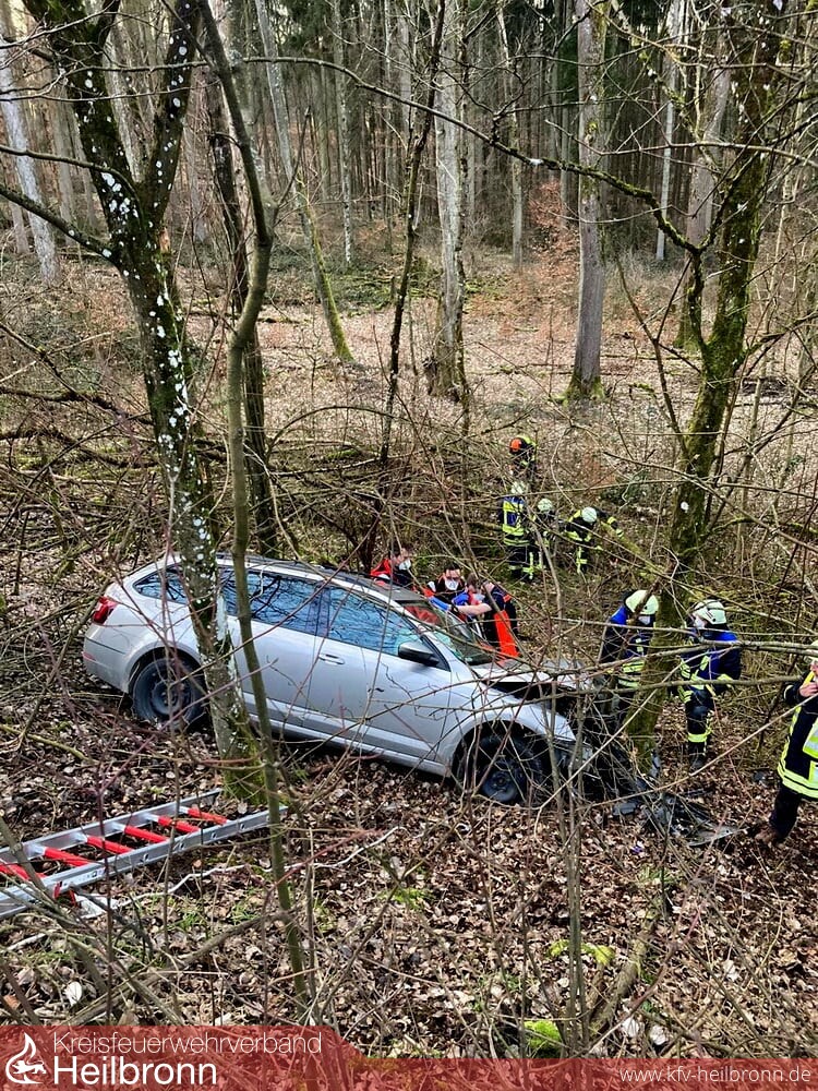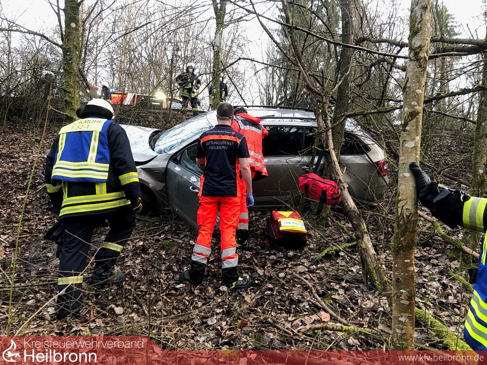 Aus ungeklärter Ursache war eine junge Mutter mit Ihrem vier Monate alten Baby in einer Rechtskurve nach links von der Fahrbahn abgekommen, fuhr eine Böschung hinab, kollidierte frontal mit einem Baum und konnte sich nicht selbständig aus ihrem PKW befreien. Ersthelfer konnten das Baby aus dem Fahrzeug retten, während Rettungsdienst und Feuerwehr die Mutter aus dem Fahrzeug retten konnten. Die Feuerwehr erstellte einen Rettungsweg durch den Wald um die Mutter zum Rettungswagen zu bringen. Die Zusammenarbeit zwischen Rettungsdienst und Feuerwehr funktionierte sehr gut und war für alle Beteiligte erfolgreich.