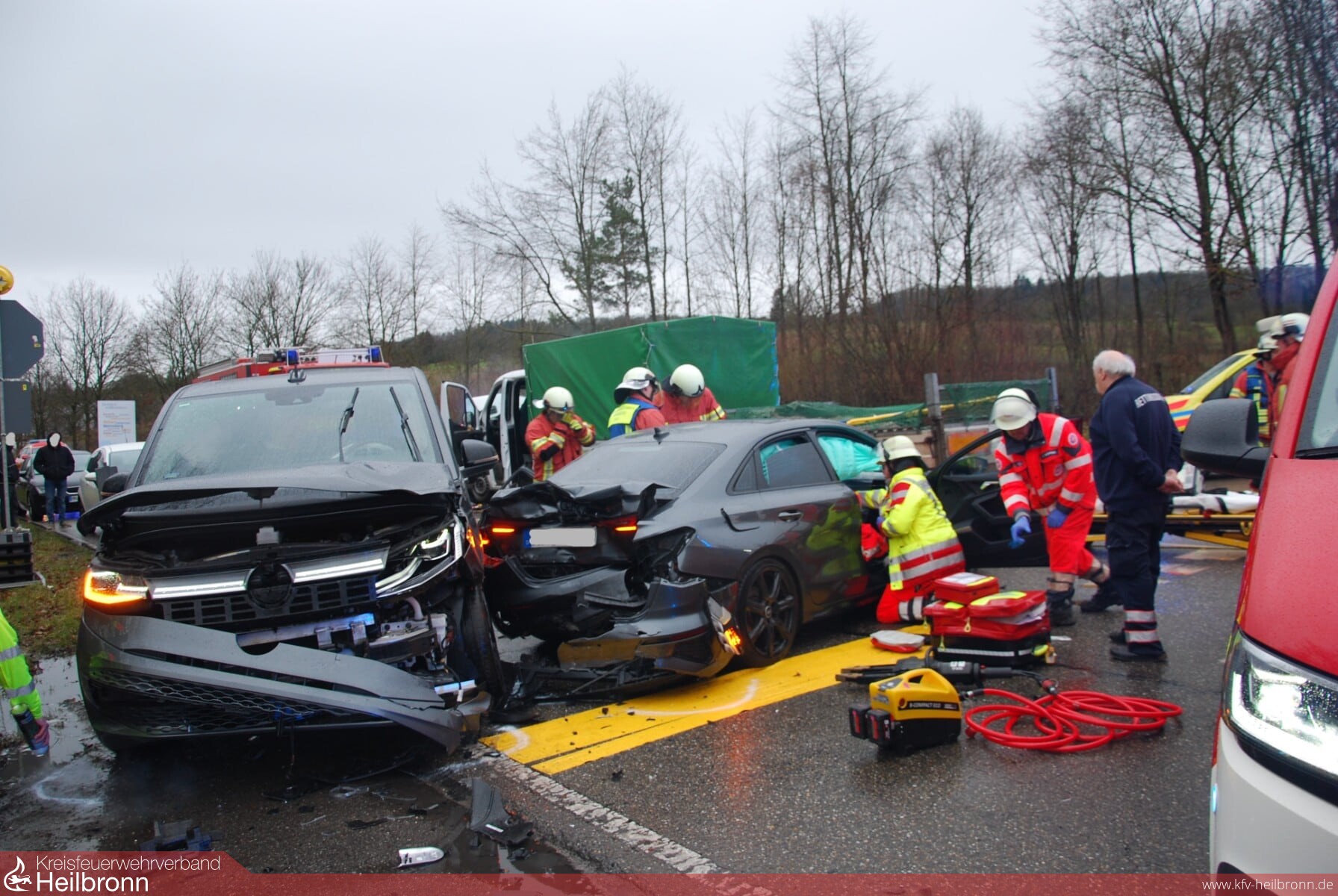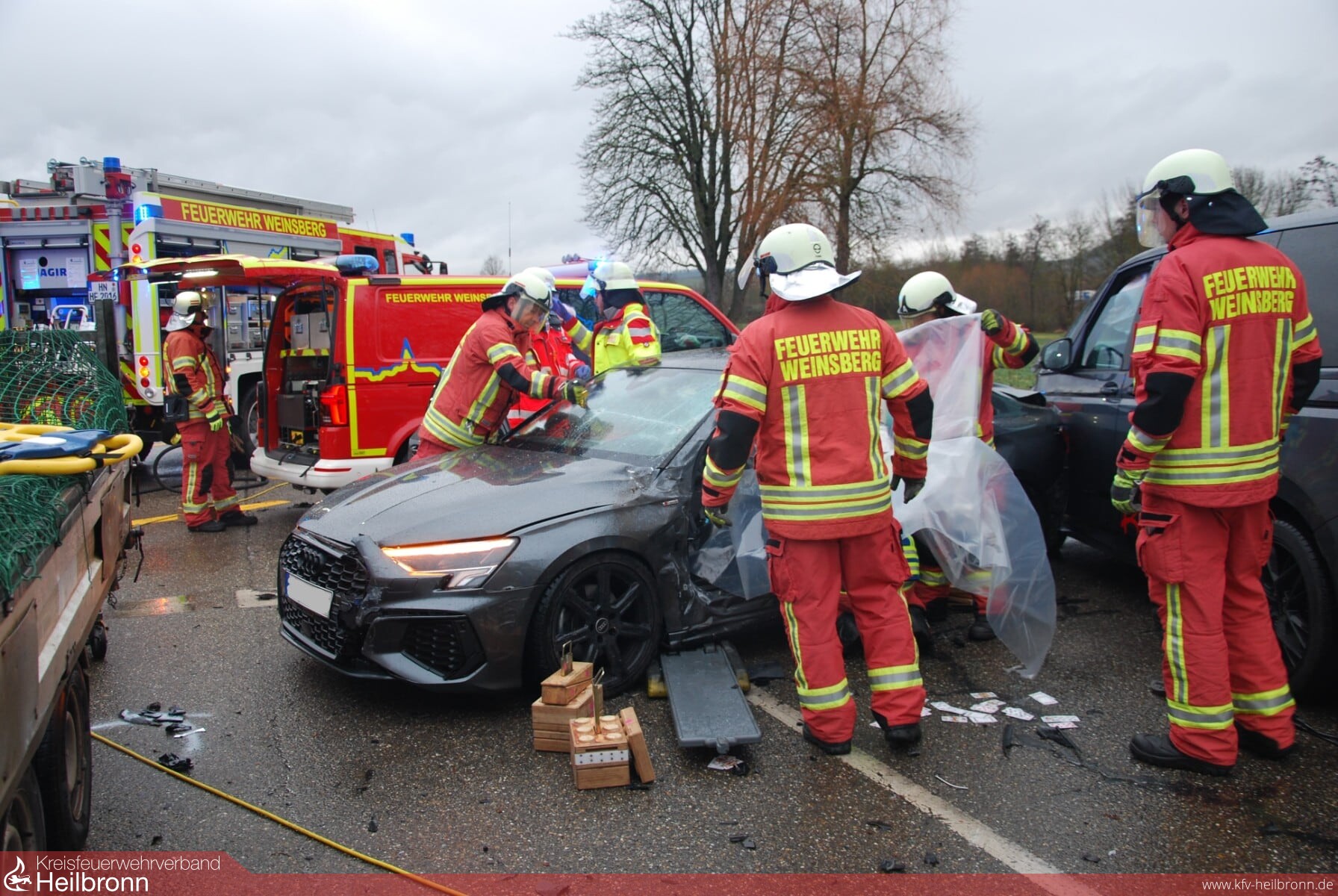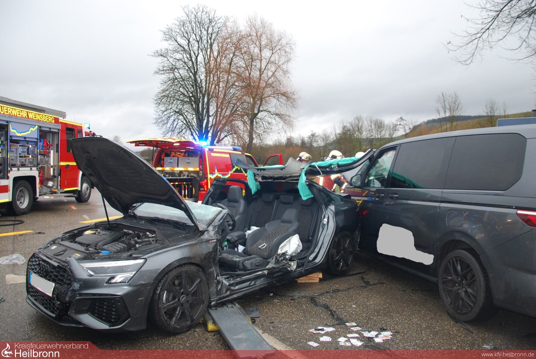 An der Abfahrt der B39 zur aktuellen Umleitungsstrecke kam es am Mittwochvormittag zu einem Verkehrsunfall mit drei PKW. Beim Eintreffen der Feuerwehr Weinsberg befanden sich noch zwei Fahrer in ihren Fahrzeugen. Der Fahrer eines Sprinters konnte sein Fahrzeug selbstständig verlassen, der Fahrer eines Audi war in seinem Fahrzeug eingeschlossen.