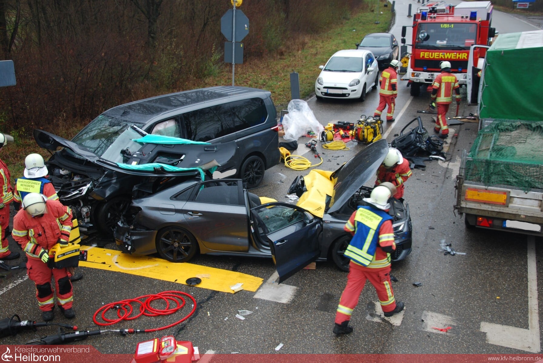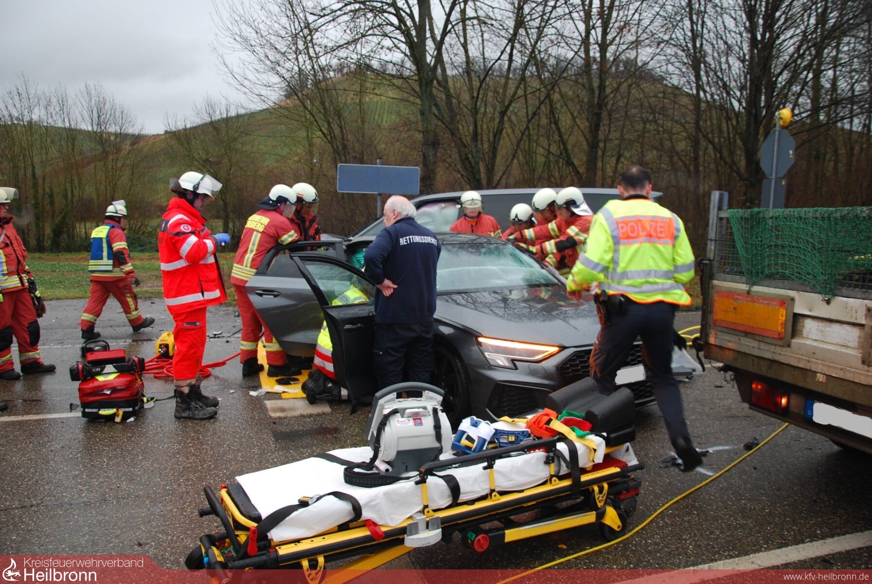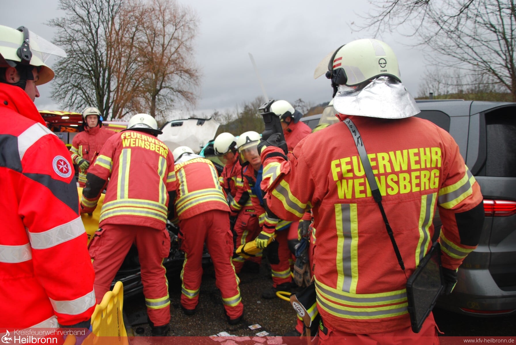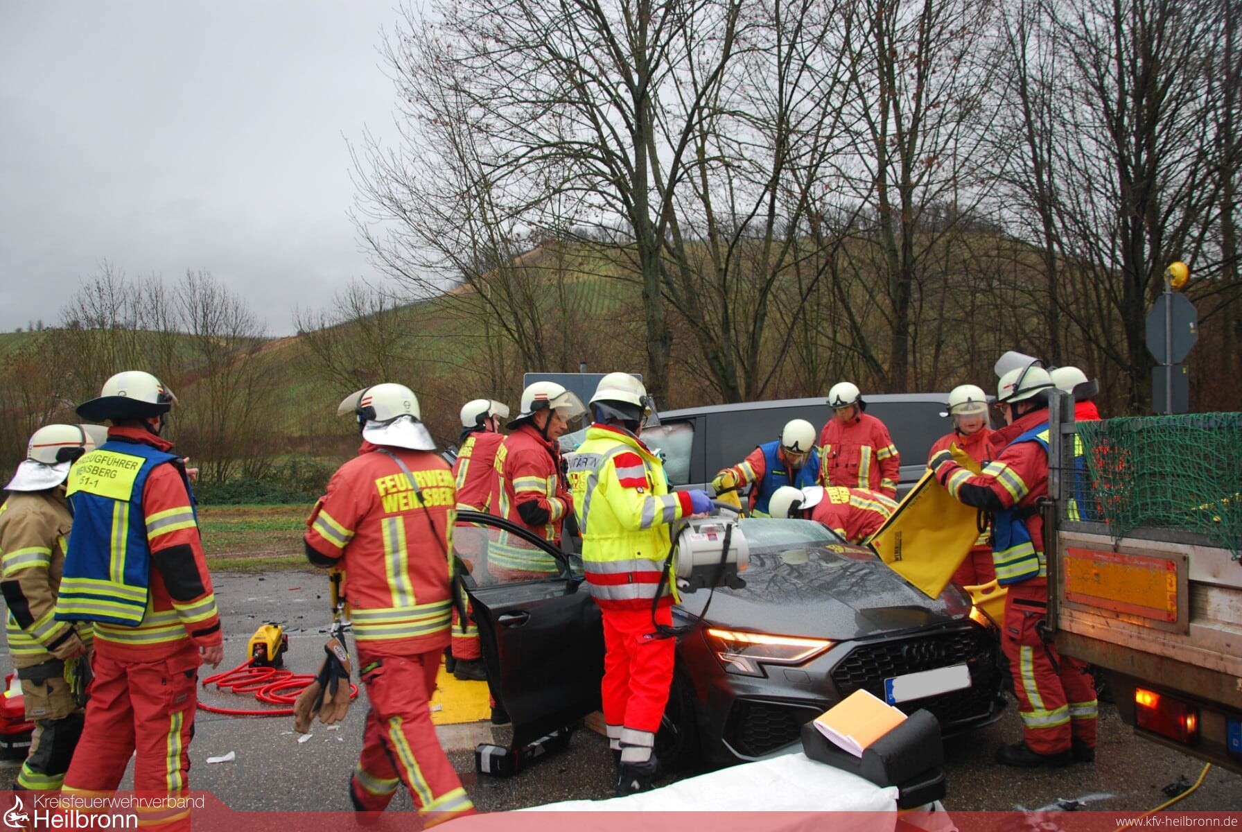 An der Abfahrt der B39 zur aktuellen Umleitungsstrecke kam es am Mittwochvormittag zu einem Verkehrsunfall mit drei PKW. Beim Eintreffen der Feuerwehr Weinsberg befanden sich noch zwei Fahrer in ihren Fahrzeugen. Der Fahrer eines Sprinters konnte sein Fahrzeug selbstständig verlassen, der Fahrer eines Audi war in seinem Fahrzeug eingeschlossen.