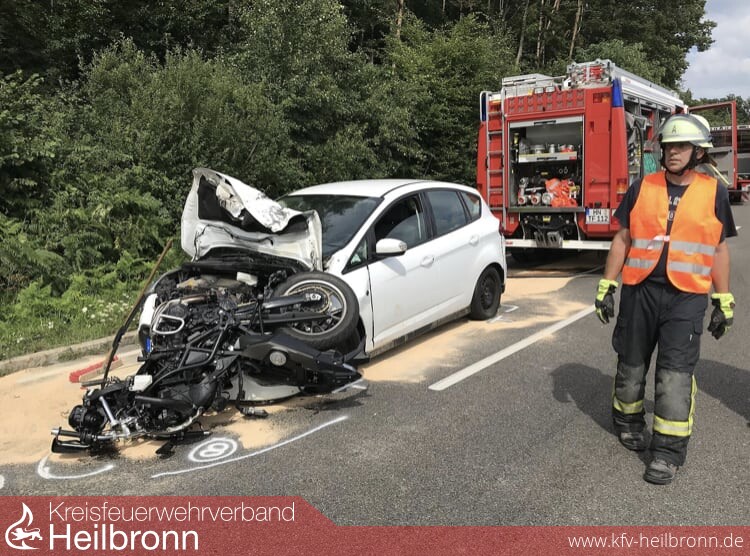 Zu einem schweren Verkehrsunfall zwischen einem Motorrad und 2 PKW, auf der B39 zwischen Wüstenrot und Löwenstein-Hirrweiler, wurde die Feuerwehr Löwenstein am Sonntag alarmiert. Bereits bei der Abfrage im Feuerwehrhaus wurde durch die ILS Heilbronn mitgeteilt das es sich um eine größere Anzahl an Verletzen handelt, der Rettungsdienst bereits vor Ort ist und eine Person reanimationspflichtig sei. Umgehend wurde daher auf GAS 2 erhöht und weitere Kräfte nachalarmiert. Beim Eintreffen an der Einsatzstelle wurde sofort der Rettungsdienst bei der Reanimation und der Betreuung der am Unfallgeschehen beteiligten Personen unterstützt und die Unfallstelle, welche sich über 150m zog, abgesperrt und abgesichert.