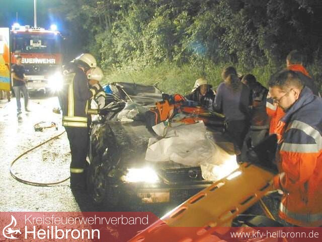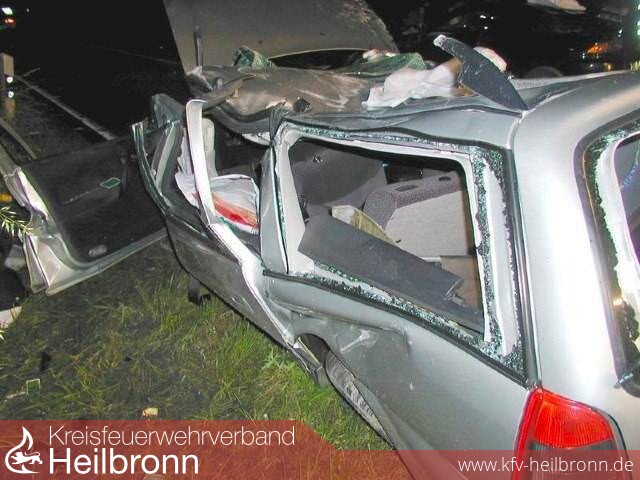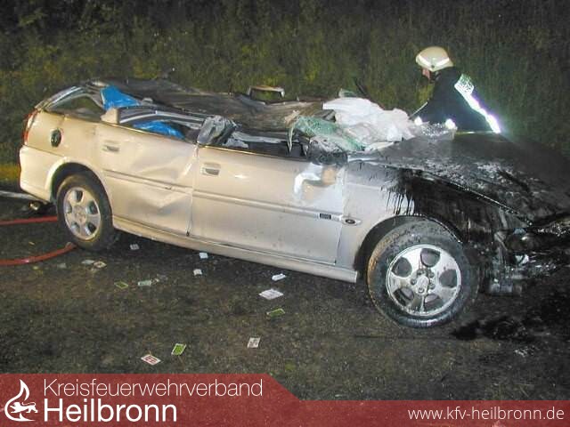 Zu einem schweren Verkehrunfall musste am frühen Dienstagmorgen der Gerätezug der Heilbronner Feuerwehr ausrücken. Ein Autofahrer war von Weinsberg kommend in Richtung Heilbronn unterwegs. In einer langgezogenen Rechtskurve verlor der Mann die Kontrolle über sein Fahrzeug und kam nach rechts von der Fahrbahn ab. Hierbei geriet er ins Schleudern, überschlug sich mehrfach und kollidierte schließlich mit einem entgegenkommenden PKW. Mit schwersten Verletzungen wurde der 36-Jährige in seinem völlig deformierten Fahrzeug eingeklemmt.