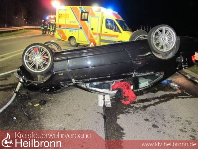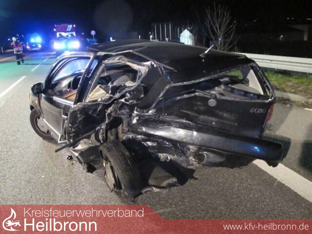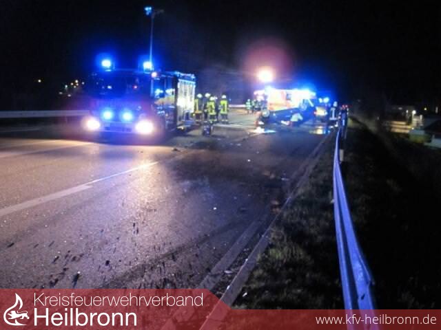 Im Bereich der Auffahrt Leingarten-Mitte kam es zum Zusammenstoß zwischen einem mit zwei Personen besetzten BMW und einem VW Polo, in welchem sich ebenfalls zwei Personen befanden. Durch den Unfall überschlug sich der BMW und blieb auf dem Dach liegen. Durch den heftigen Aufprall wurden beide Fahrzeuge stark deformiert und die Insassen verletzt. Die Fahrerin des VW Polo wurde dabei so schwer verletzt, dass sie sich nicht mehr selbständig aus dem Fahrzeugwrack befreien konnte.