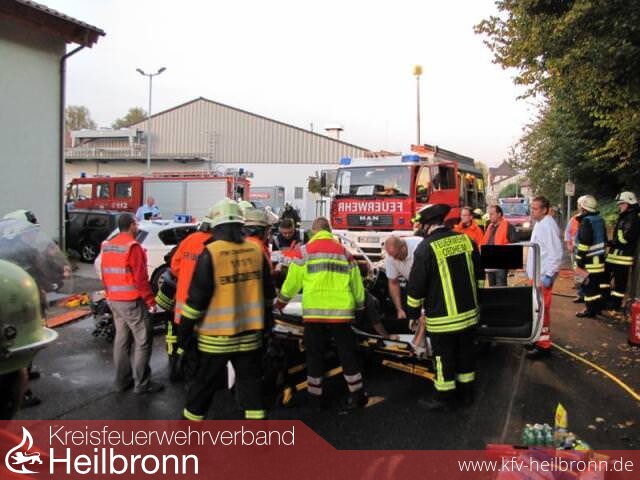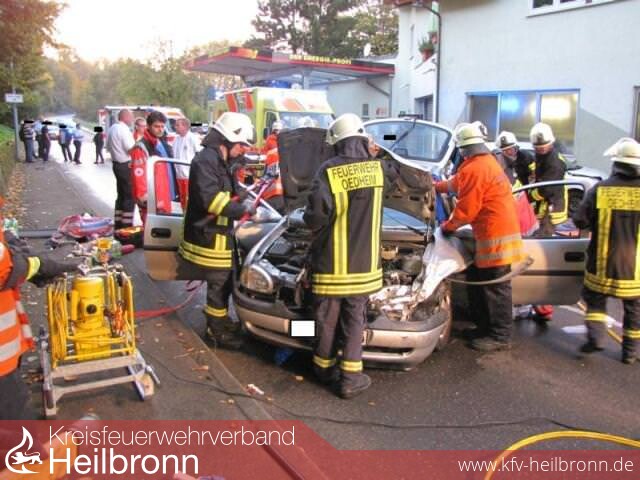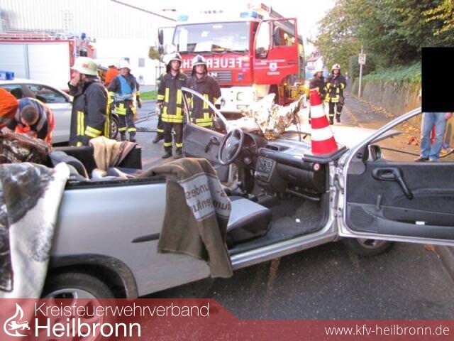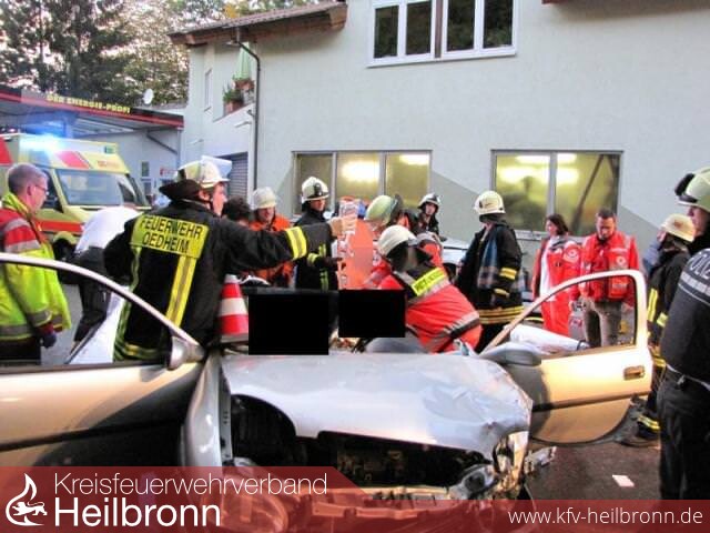 In der Kochendorfer Straße kam es zu einem Verkehrsunfall mit zwei verletzten Personen. Die Feuerwehr enfernte mittels hydraulischem Rettungsgerät das Dach des verunfallten PKW um Zugang für den Rettungsdienst zu schaffen. Nach Erstversorgung wurden die Personen mittels Spineboard gerettet und an den Rettungsdienst übergeben. Die Unfallstelle wurde ausgeleuchtet und abgesichert.
