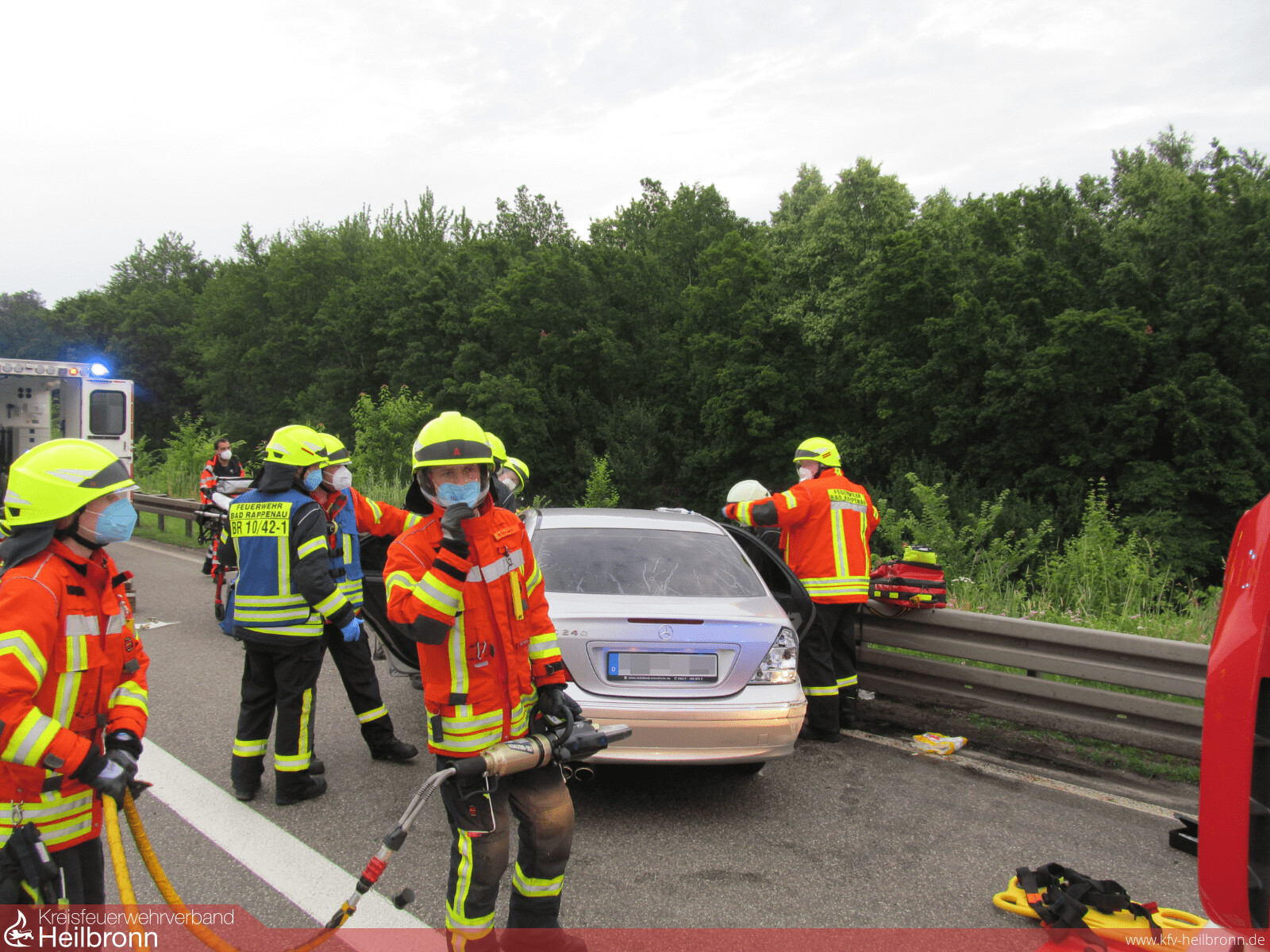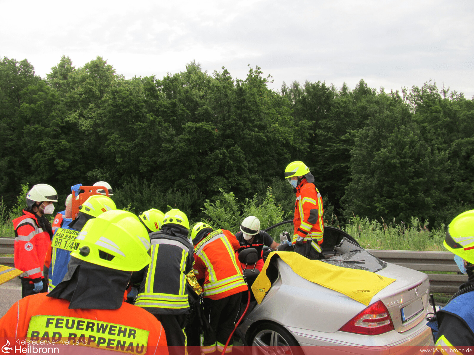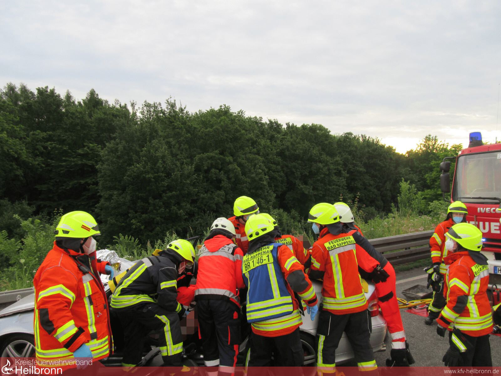 Mit dem Alarmstichwort „Verkehrsunfall PKW“ wurden die Abteilungen Bad Rappenau und Süd auf die Bundesautobahn 6 in Fahrtrichtung Sinsheim alarmiert. Aus bislang ungeklärter Ursache schlug ein PKW kurz vor der Ausfahrt Parkplatz Bauernwald frontal auf der Beifahrerseite in eine Leitplanke ein. Hierbei wurde der Fahrer schwer verletzt. Um weitere Schädigungen an der Wirbelsäule zu vermeiden, wurde sich unter Abstimmung mit dem Notarzt und dem Rettungsdienst vor Ort für eine schonende Rettung entschieden. Hierbei entfernte die Feuerwehr mithilfe von schwerem hydraulischem Rettungsgerät das Dach des Fahrzeuges, um den Patient anschließend und gemeinsam mit dem Rettungsdienst achsengerecht aus dem Fahrzeug retten zu können. Nach der Befreiung des Patienten wurde von der Feuerwehr noch die Batterie vorsorglich abgeklemmt, sowie auslaufende Betriebsmittel aufgenommen. Anschließend wurde die Einsatzstelle der Polizei übergeben und die Freiwillige Feuerwehr Bad Rappenau konnte wieder einrücken. Die Feuerwehr Bad Rappenau war insgesamt mit 5 Fahrzeugen und 20 Einsatzkräften im Einsatz.