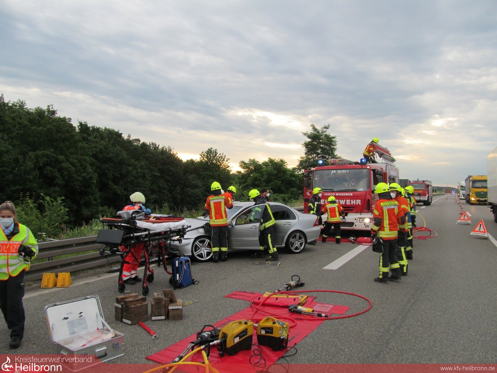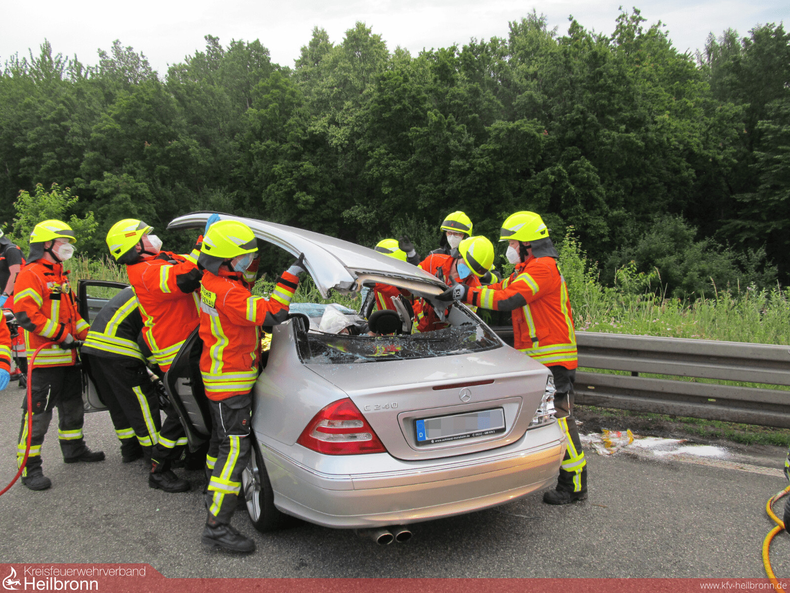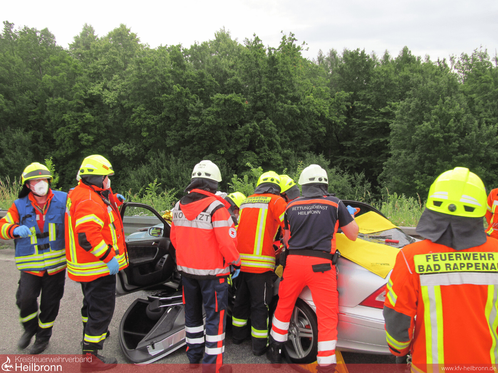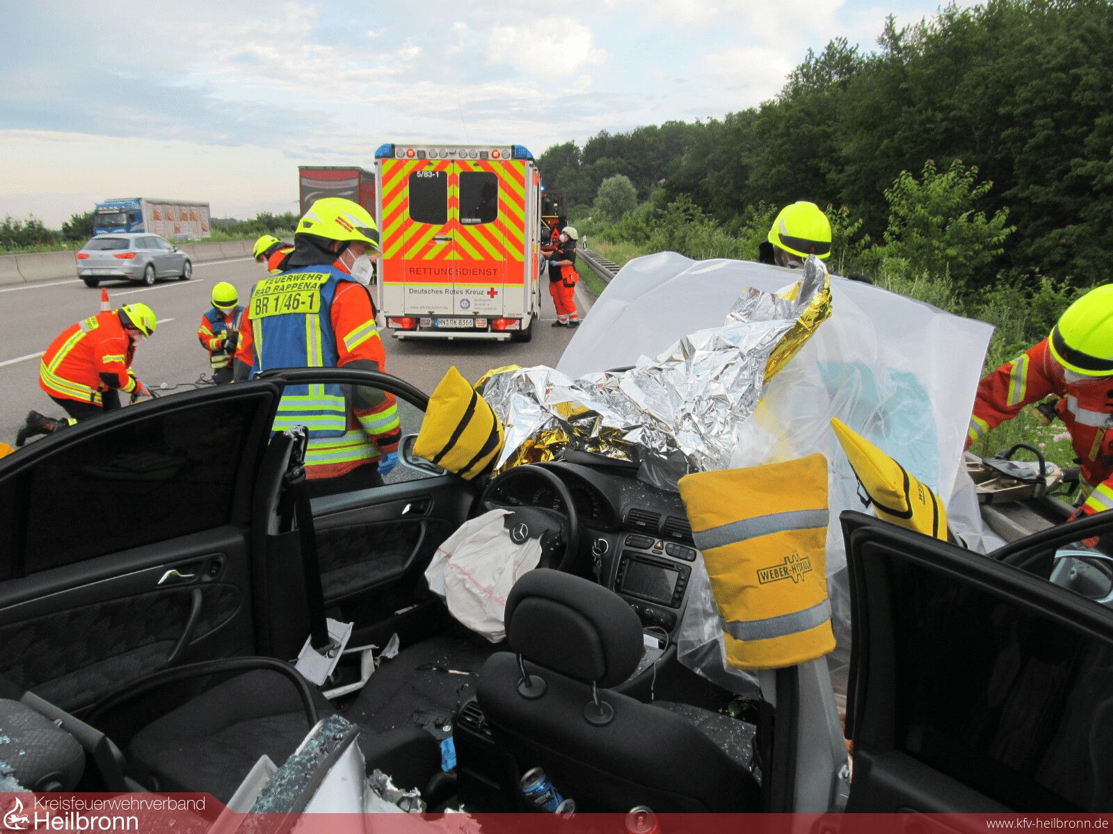 Mit dem Alarmstichwort „Verkehrsunfall PKW“ wurden die Abteilungen Bad Rappenau und Süd auf die Bundesautobahn 6 in Fahrtrichtung Sinsheim alarmiert. Aus bislang ungeklärter Ursache schlug ein PKW kurz vor der Ausfahrt Parkplatz Bauernwald frontal auf der Beifahrerseite in eine Leitplanke ein. Hierbei wurde der Fahrer schwer verletzt. Um weitere Schädigungen an der Wirbelsäule zu vermeiden, wurde sich unter Abstimmung mit dem Notarzt und dem Rettungsdienst vor Ort für eine schonende Rettung entschieden. Hierbei entfernte die Feuerwehr mithilfe von schwerem hydraulischem Rettungsgerät das Dach des Fahrzeuges, um den Patient anschließend und gemeinsam mit dem Rettungsdienst achsengerecht aus dem Fahrzeug retten zu können. Nach der Befreiung des Patienten wurde von der Feuerwehr noch die Batterie vorsorglich abgeklemmt, sowie auslaufende Betriebsmittel aufgenommen. Anschließend wurde die Einsatzstelle der Polizei übergeben und die Freiwillige Feuerwehr Bad Rappenau konnte wieder einrücken. Die Feuerwehr Bad Rappenau war insgesamt mit 5 Fahrzeugen und 20 Einsatzkräften im Einsatz.