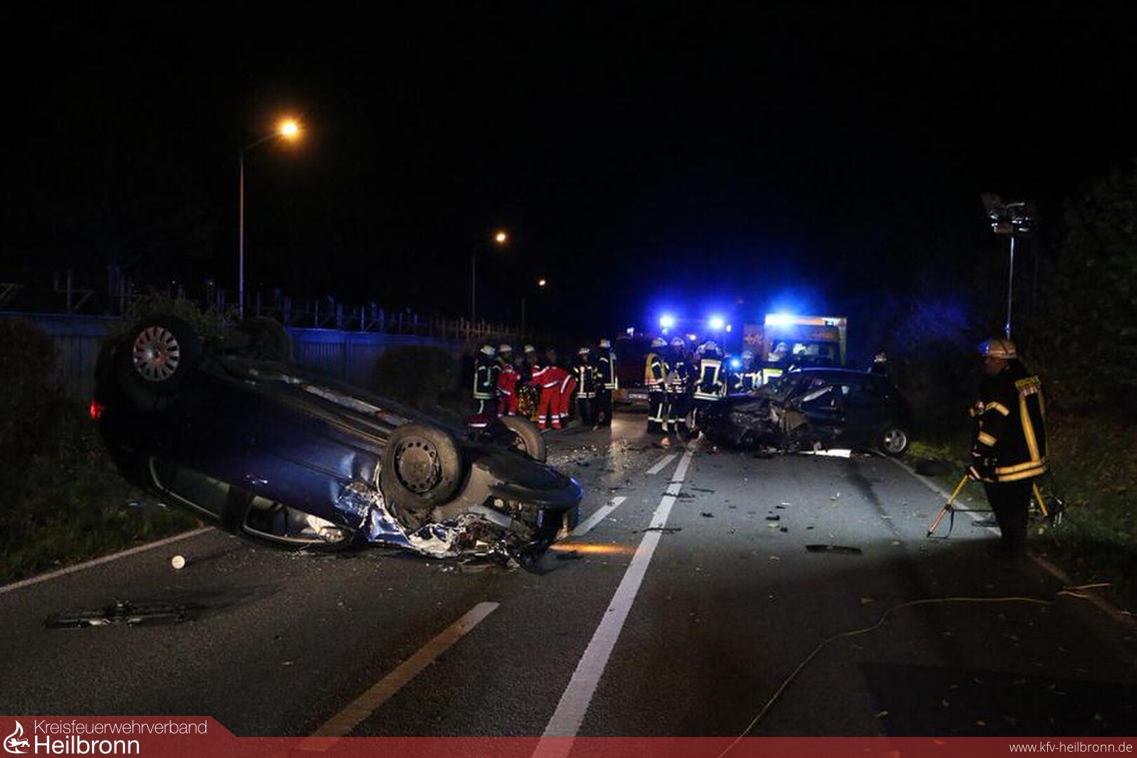 Vor Ort waren zwei PKWs frontal aufeinandergestoßen. Durch ein versuchtes Ausweichmannöver und den Aufprall wurde ein Fahrzeug auf sein Dach geschleudert. Alle drei verletzte Personen wurden von der Feuerwehr und dem Rettungsdienst betreut und anschließend in Krankenhäuser eingeliefert. Die Unfallstelle wurde ausgeleuchtet, der Brandschutz sichergestellt und die Fahrzeuge stromlos geschalten. Es erfolgte eine Komplettsperrung der Verbindungsstraße Neckarwestheim-Gemmrigheim.