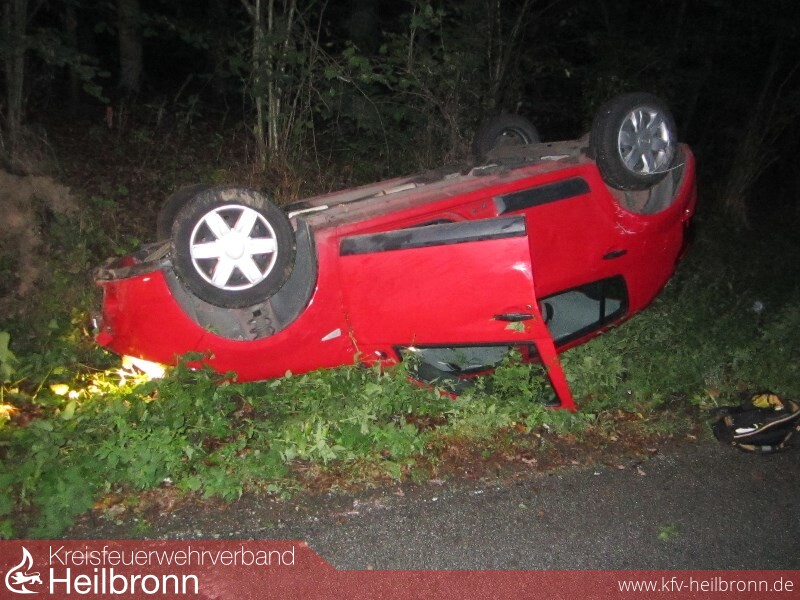 Ein aus Richtung Freudental kommender PKW geriet in Höhe des Wildparadies Tripsdrill nach rechts in den Seitenstreifen. Vermutlich beim Versuch gegenzulenken prallte der PKW dann auf die Böschung auf der linken Straßenseite und überschlug sich. Beim Eintreffen der ersten Kräfte der Feuerwehr wurde die Person bereits im Rettungswagen betreut. Da auch keine Betriebsstoffe am PKW ausliefen, beschränkten sich die Tätigkeiten der Feuerwehr somit auf das Absichern und Ausleuchten der Einsatzstelle.