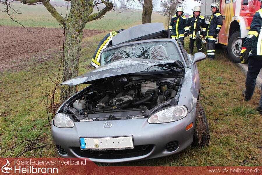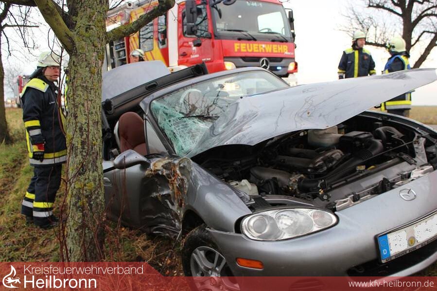 Nach dem Eintreffen an der Einsatzstelle konnte festgestellt werden, dass ein PKW nach rechts von der Fahrbahn abgekommen und seitlich gegen einen Baum geprallt war. Weitere Fahrzeuge waren an diesem Unfall nicht beteiligt. Die Einsatzkräfte aus Güglingen und Heilbronn konnten den Einsatz deshalb bereits auf der Anfahrt wieder beenden.