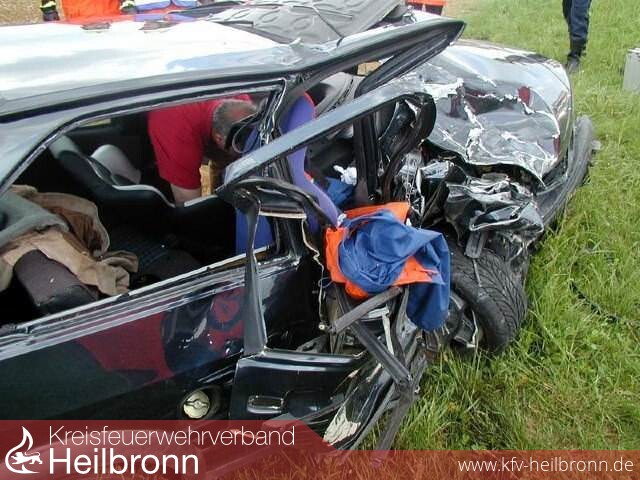 Eines der beiden Unfallfahrzeuge kam bei dem Frontalzusammenstoß von der Straße ab und blieb auf einem Acker stehen. Aufgrund der starken Deformation des Kleinwagens war es nur unter Einsatz von technischen Hilfeleistungsgeräten möglich die Fahrertür zu öffnen. Der eingeklemmte Fahrer war ansprechbar und klagte über sehr starke Schmerzen im rechten Beinbereich.