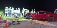 Beim Eintreffen an der Unfallstelle bot sich uns folgendes Bild: Ein Frontalzusammenstoß zwischen zwei PKWs und ein leicht beschädigter Linienbus. Der Rettungsdienst befand sich bereits vor Ort.