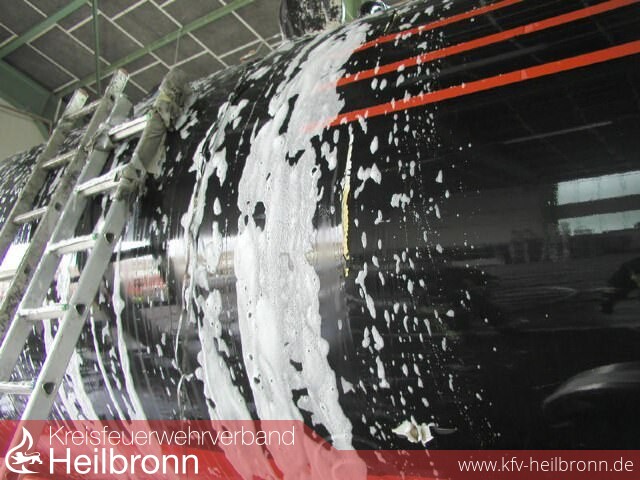 Unter Einsatz von zwei Hohlstrahlrohren wurde der Auflieger gekühlt. Im Anschluss öffnete ein Trupp unter Hitzeschutz vorsichtig den Domdeckel des Tanks und flutete diesen mit Schaum.