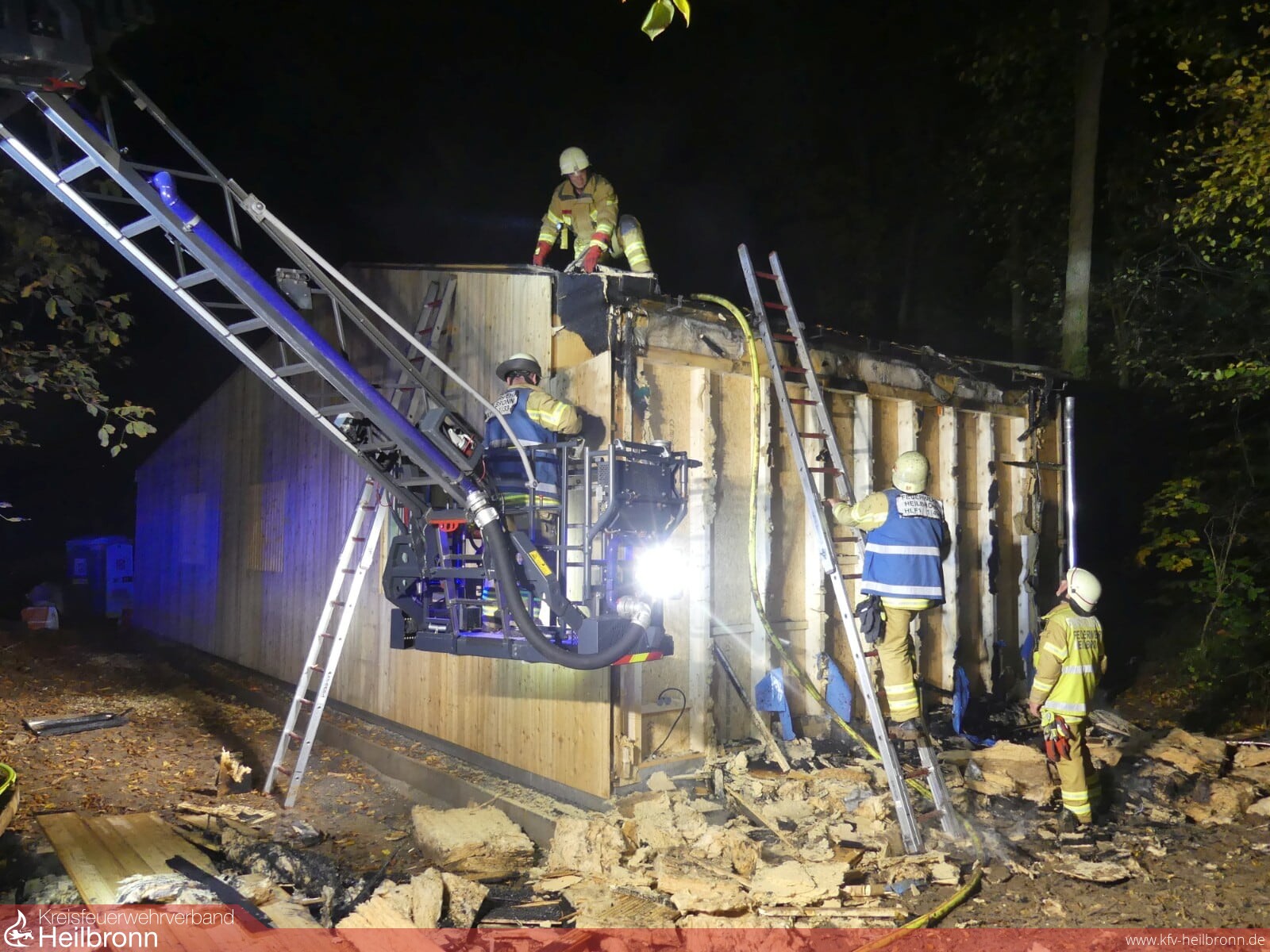 Zu einem weiteren Brandeinsatz musste die Feuerwehr gegen 20.53 Uhr zum Pfühlpark ausrücken. Dort war die Außenhaut einer noch im Bau befindlichen Unterkunft des Betriebsamtes in Brand geraten. Mit Unterstützung der Freiwilligen Feuerwehr, Abteilung Sontheim konnte das Feuer schnell gelöscht werden. Für die Nachlöscharbeiten mussten Teile der Holzverkleidung und des Daches entfernt werden. Durch das beherzte und schnelle Eingreifen der Feuerwehr entstand im Inneren des Gebäudes kein Schaden.