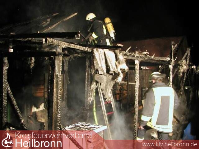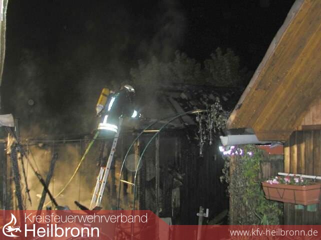 Als die Einsatzkräfte der Feuerwehr um 23.06 Uhr an der Einsatzstelle eintrafen, brannte dies bereits in voller Ausdehnung. Die Fahrzeuge konnten nicht in das Kleingartengelände einfahren, so dass ca. 200 m B-Leitung verlegt werden mussten. Eine im Wirkungsbereich des Brandes stehende Gasflasche konnte vor dem Bersten geborgen und gekühlt werden.