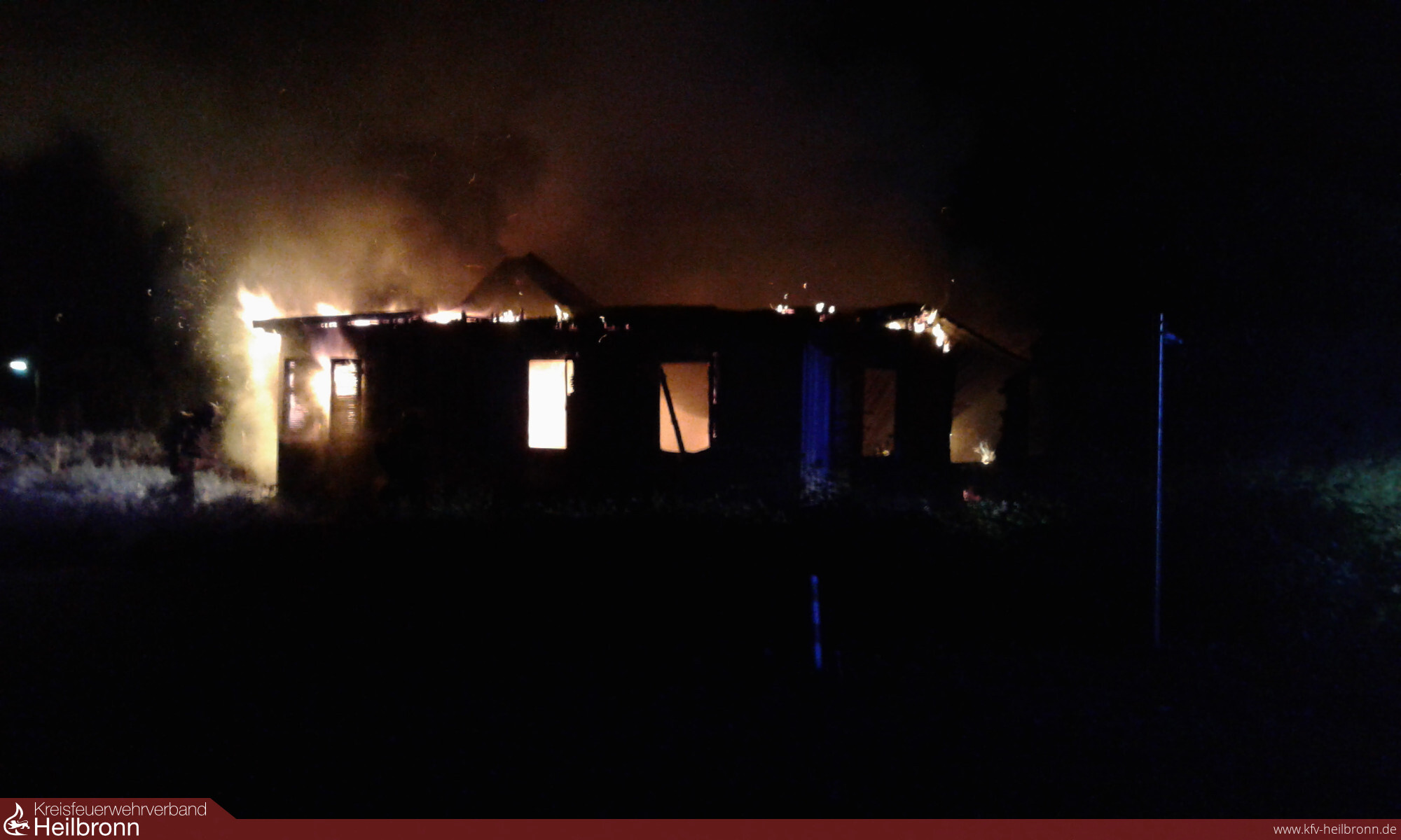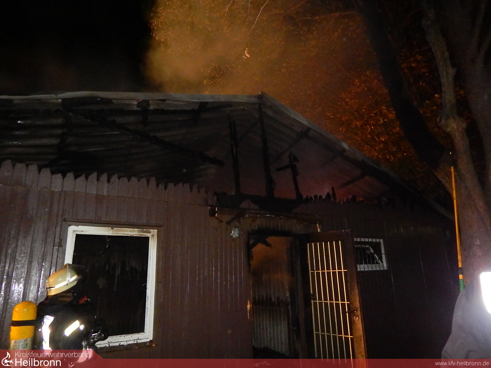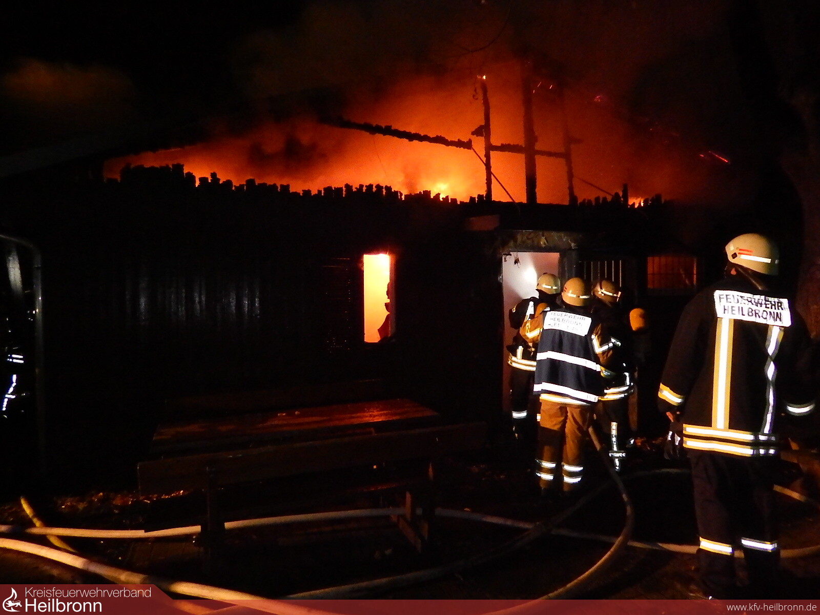 Kurz nach 23:00 Uhr wurde die Feuerwehr zu einer brennenden Holzhütte im Bereich einer Kleingartenanlage in Sontheim alarmiert. Bei der Erkundung stellte sich heraus, dass eine große Hütte am Rande des Hochschulcampus in voller Ausdehnung brannte.