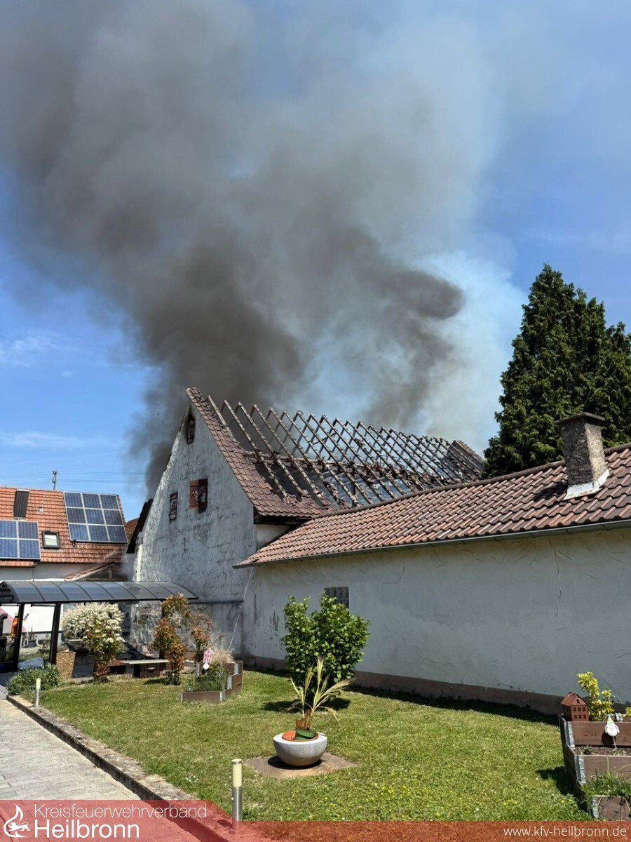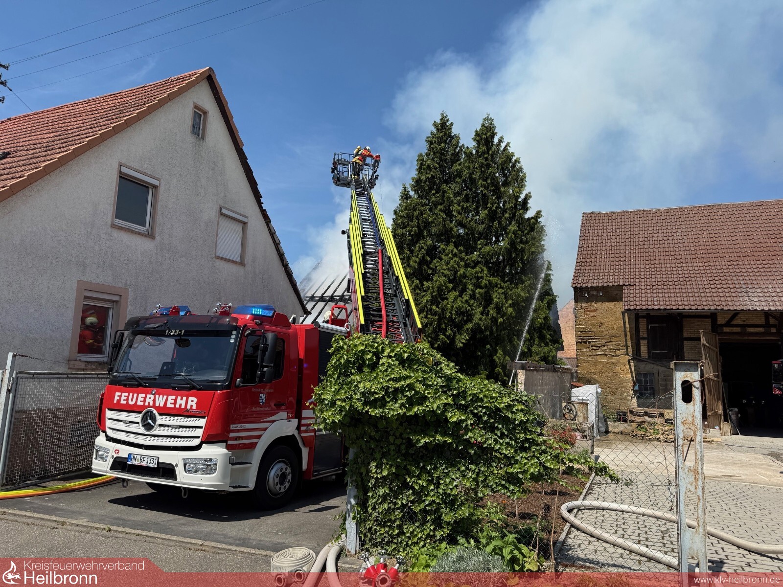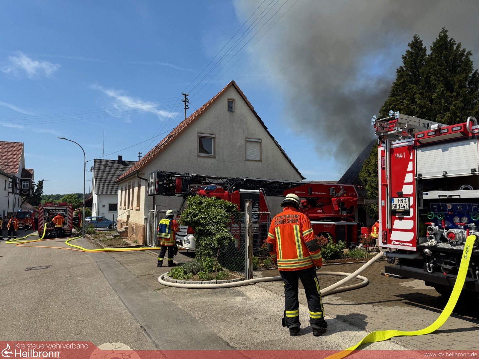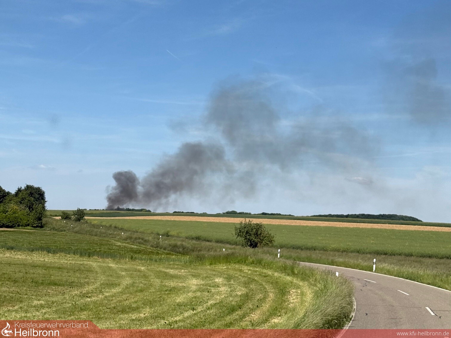 Am Mittwoch, den 14.05.2025 um 12:17 Uhr wurde die Feuerwehr Gundelsheim mit den Abteilungen Gundelsheim, Bachenau und Obergriesheim, sowie die Drehleiter und Wechsellader Fahrzeug mit dem Abrollbehälter Lösch aus Bad Friedrichshall zu einem Brand in einem landwirtschaftlichen Anwesen nach Bachenau alarmiert.