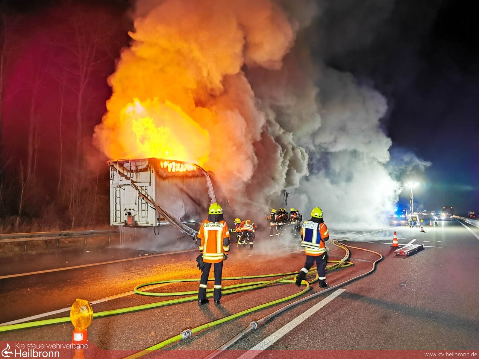 Beim Eintreffen der ersten Einsatzkräfte stand ein mit Reifen beladener Auflieger in Vollbrand. Der Fahrer des LKW konnte seine Zugmaschine zuvor noch abkoppeln und sich sowie das Zugfahrzeug in Sicherheit bringen.