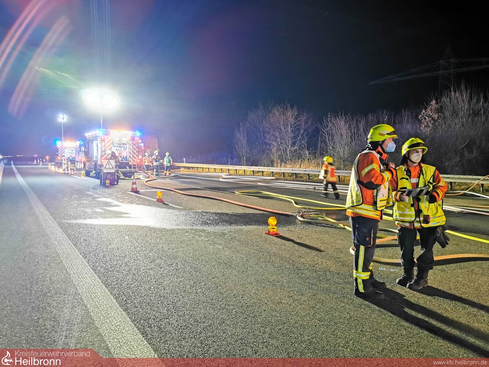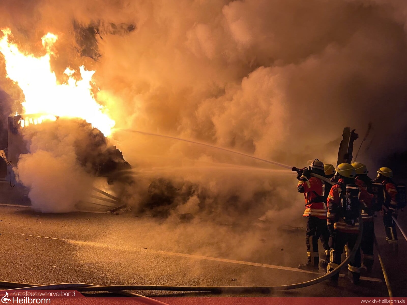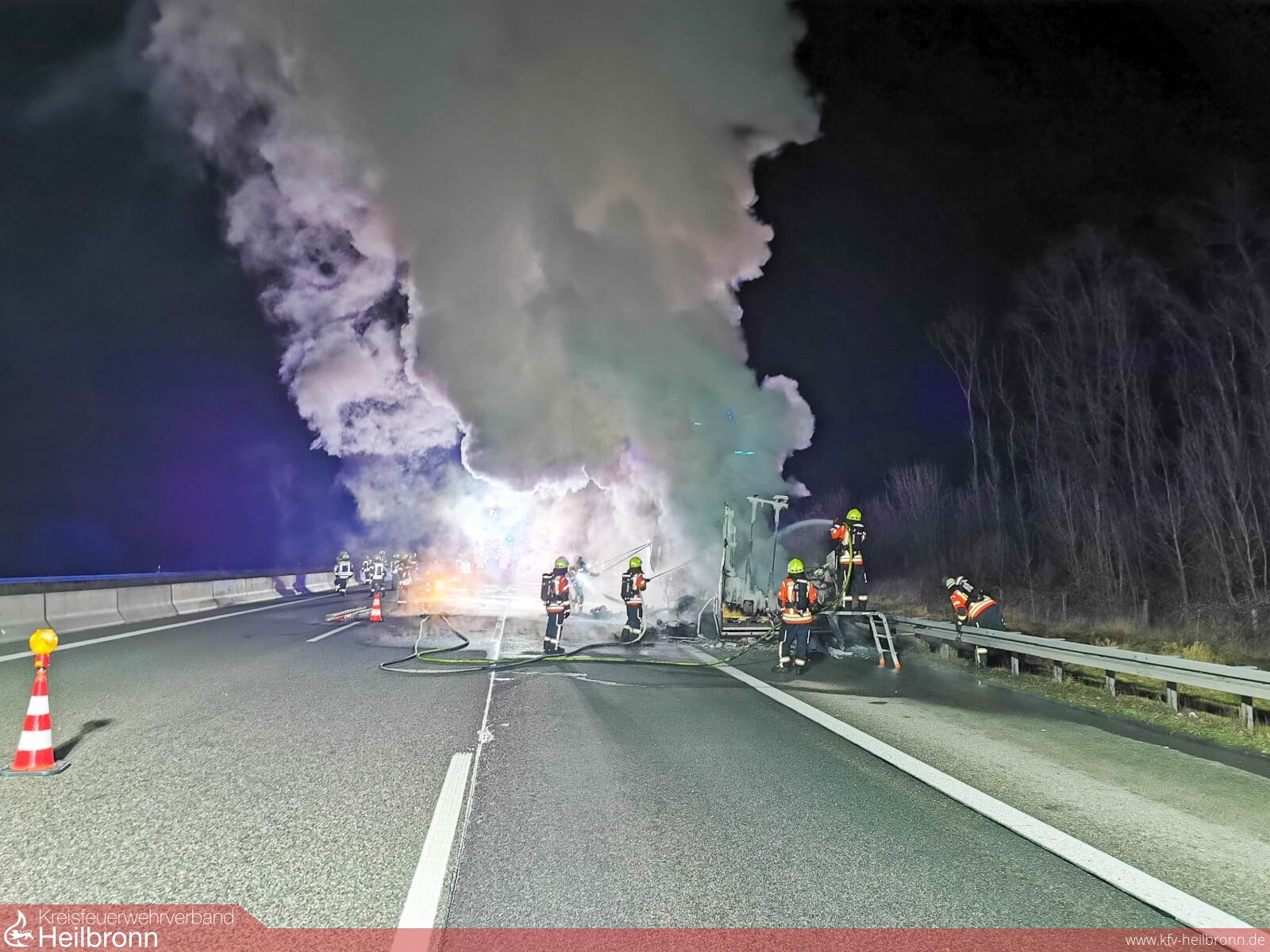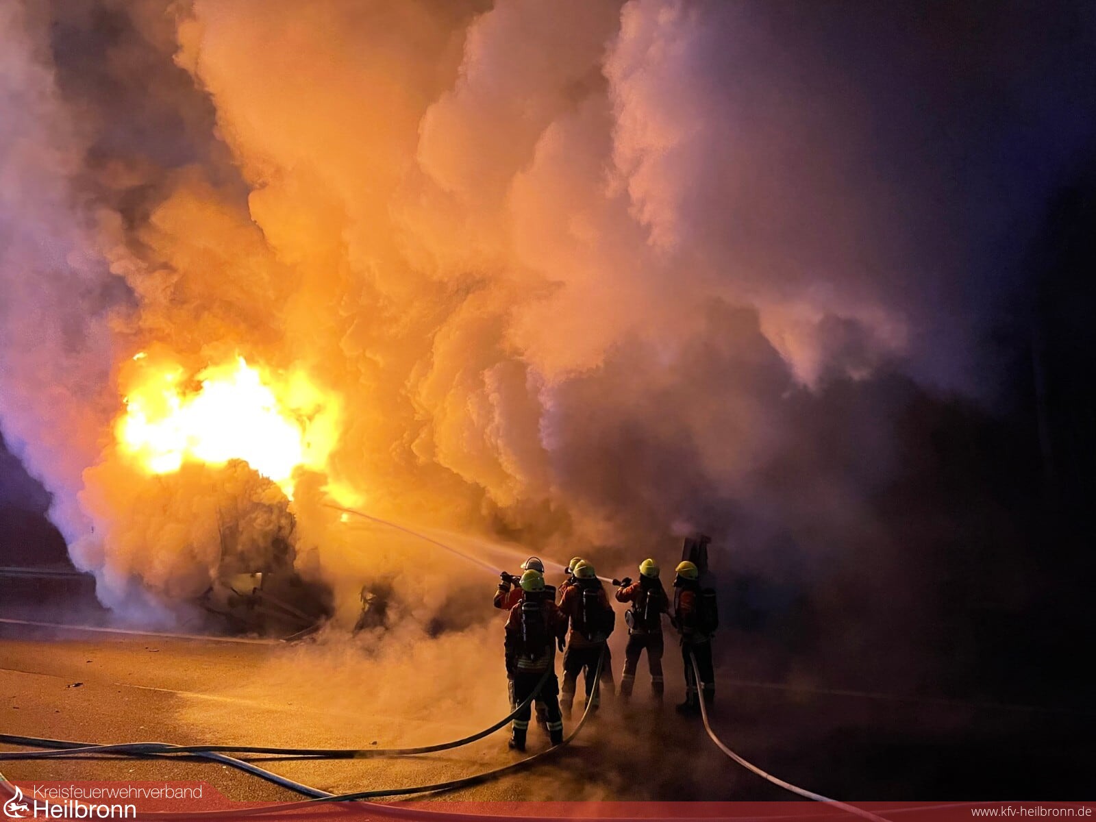Die Feuerwehr Bad Rappenau begann sofort mit den Löschmaßnahmen mit 4 C-Hohlstrahlrohren. Da die einzige Wasserquelle auf der Autobahn die Tanks der Löschfahrzeuge sind, wurden zusätzlich die Feuerwehren Sinsheim sowie die Abteilung Grombach zur Wasserförderung alarmiert. Weiterhin befanden sich noch zwei Fahrzeuge der Feuerwehr Heilbronn vor Ort (ELW und AB Wasser), die aufgrund von ungenauen Ortsangaben ebenfalls alarmiert worden waren. Gemeinsam richtete man einen Pendelverkehr für das Löschwasser ein.