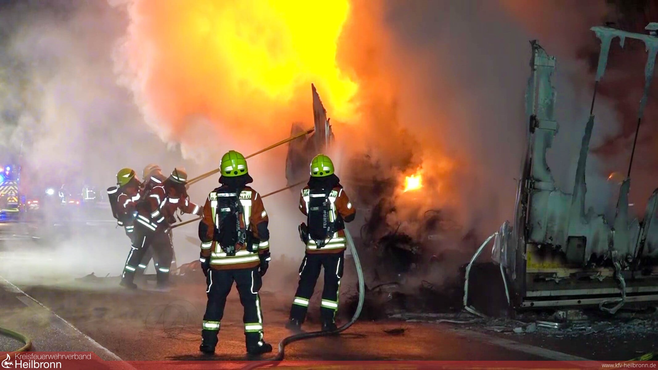 Durch die geschmolzenen Reifen war es schwierig, an die verschiedenen Brandherde heranzukommen. Hierzu musste der Auflieger teilweise abgeladen, und die Ladung auseinandergezogen werden. Gegen 07:45 Uhr war das Feuer komplett gelöscht. Um 08:45 Uhr konnte das letzte Fahrzeug der Feuerwehr Bad Rappenau die Einsatzstelle verlassen. Zuvor war noch die Abteilung Obergimpern mit ihrer Logistikkomponente alarmiert worden. Die Feuerwehr Bad Rappenau war insgesamt mit 10 Fahrzeugen und 54 Einsatzkräften vor Ort. Des Weiteren war die Berufsfeuerwehr Heilbronn mit dem Abrollbehälter Wasser, einem Einsatzleitwagen und die Feuerwehr Sinsheim mit einem Tanklöschfahrzeug im Einsatz.