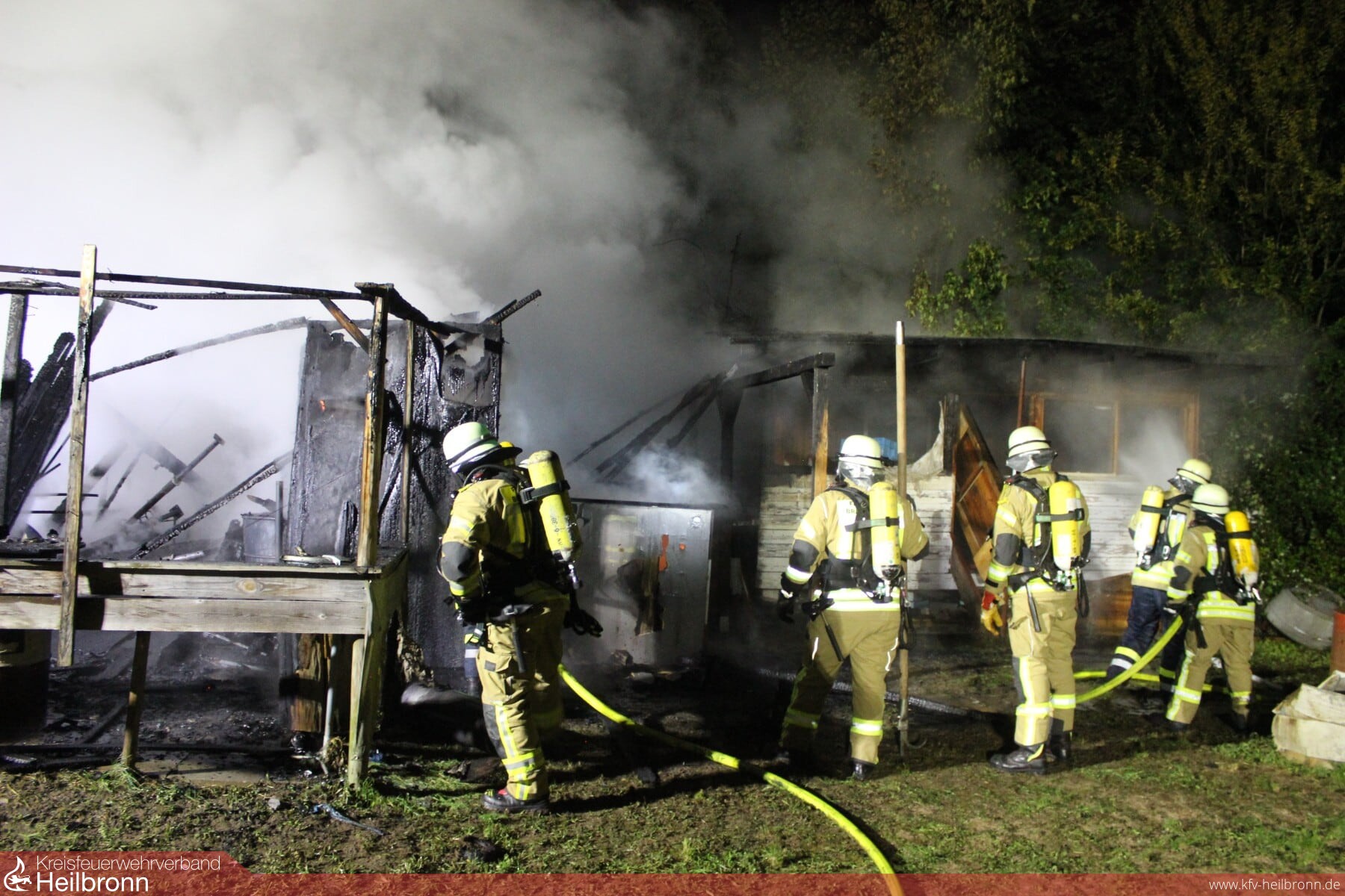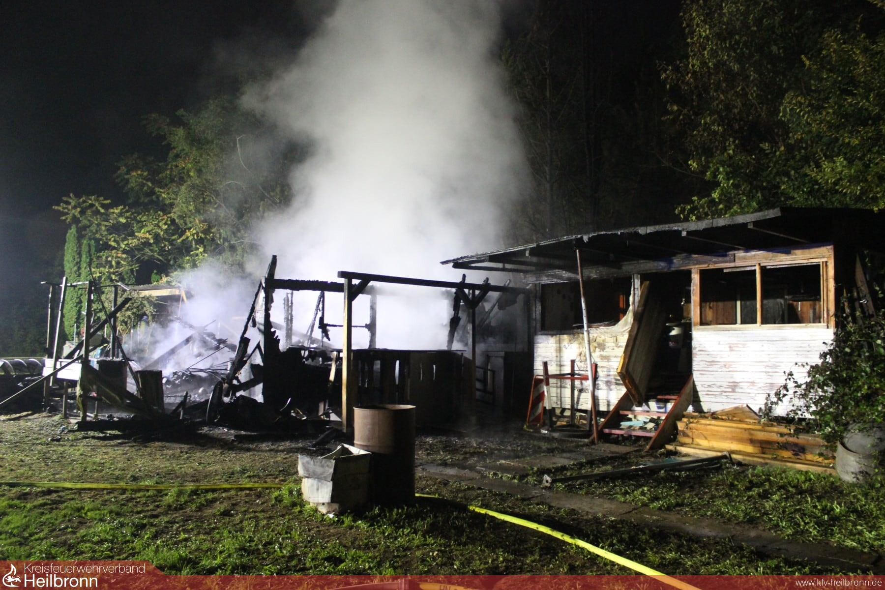 Als die Einsatzkräfte vor Ort eintrafen, stand das Clubheim eines Motorradclubs auf dem Gelände der Baumschule in Vollbrand und brannte dann auch vollständig nieder. Für die Wasserversorgung und zur Unterstützung mit Atemschutzgeräteträgern wurde im Einsatzverlauf noch die Abteilung Meimsheim hinzugezogen. Zum Ablöschen der letzten Glutnester musste das Gebäude mit einem Bagger abgetragen werden. Einsatzende war gegen 3 Uhr in der Nacht.