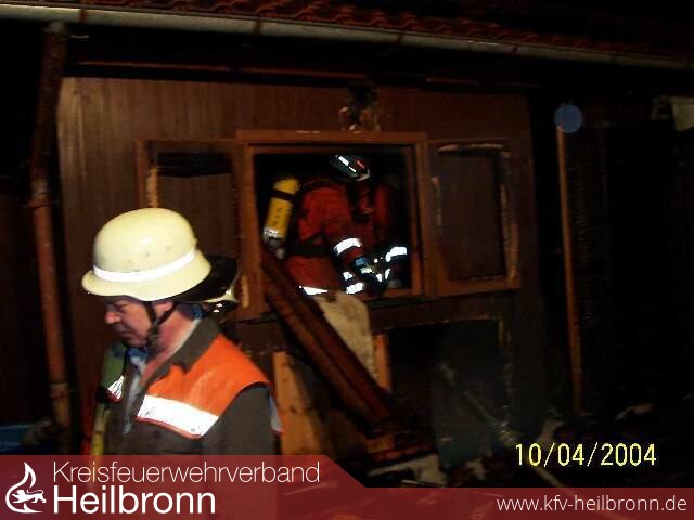 Am Ostersamstag 10.04.2004 ist ein Brand in einem Wochenendhaus aus ungeklärter Ursache entstanden. Die Feuerwehr Beilstein - Stadt und Beilstein - Schmidhausen wurden um 20.38 Uhr über die Feurwehrleitstelle Heilbronn alarmiert.
