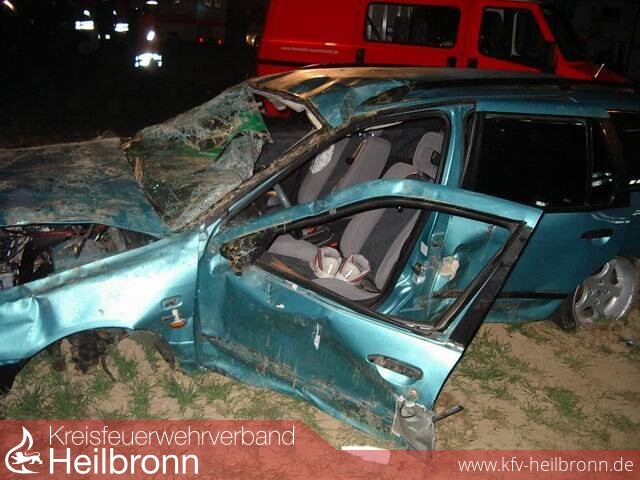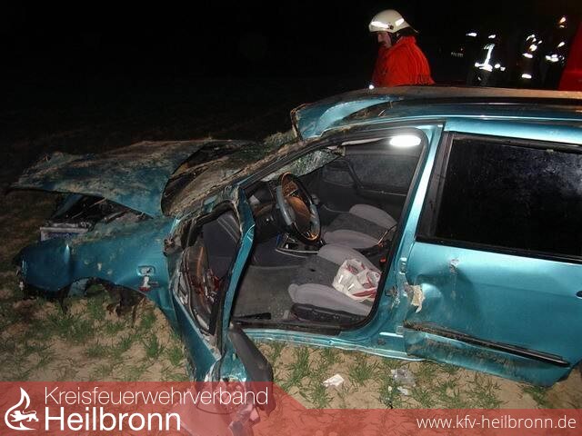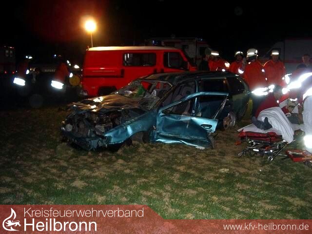 Ein junger Verkehrsteilnehmer fuhr mit hoher Geschwindigkeit von der Landkreisgrenze in Richtung Möckmühl. Kurz vor einem Aussiedlerhof kam der Fahrer mit seinem Fahrzeug von der Fahrbahn ab, überschlug sich mehrfach und blieb nach ca. 150 Meter in einem Acker liegen. Der Beifahrer wurde herausgeschleudert und schwer verletzt, von den beiden auf dem Rücksitz befindlichen Mitfahrern wurde ein junges Mädchen schwer verletzt, ein weiterer Jugendlicher erlitt leichte Verletzungen. Der Fahrer selbst war eingeklemmt und lebensgefährlich verletzt. Nicht einer der vier Jugendlichen war angeschnallt.