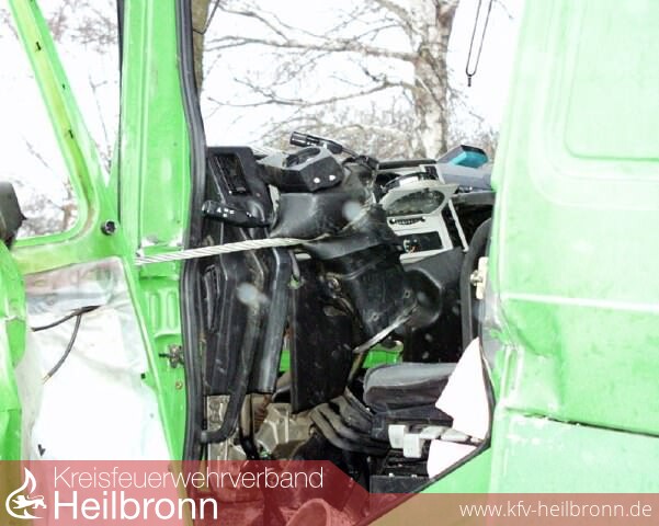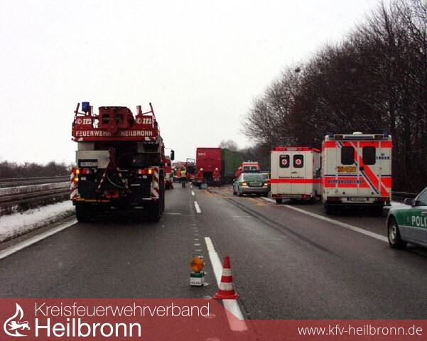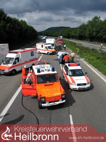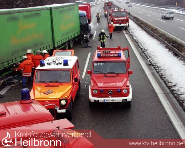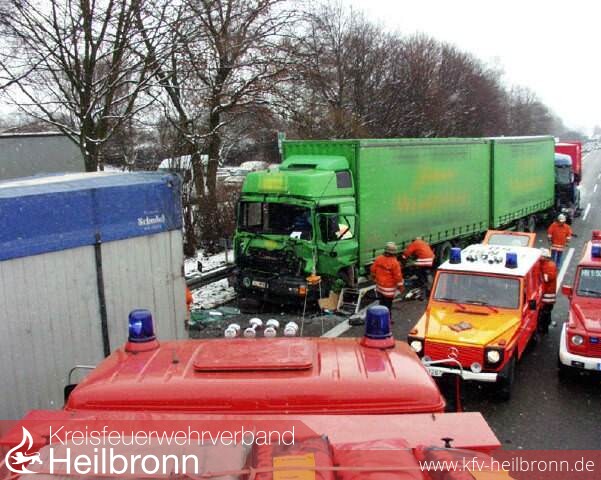 Gegen 14:13 Uhr wurde die Feuerwehr Neckarsulm zu einem LKW-Unfall auf der BAB A6 bei km 626 in Fahrtrichtung Mannheim gerufen. Dort hatte sich ein Auffahrunfall zwischen drei LKW ereignet. Hierbei war ein Fahrer in seinem LKW eingeklemmt worden. Der eingeklemmte Fahrer wurde unter Einsatz von Spreizer, Schneidegerät, Rettungszylinder und dem Einsatz der Seilwinde des RW 2 aus seiner Notlage befreit und dem Rettungsdienst übergeben. Ausgelaufenes Öl wurde mit Bindemittel aufgenommen.