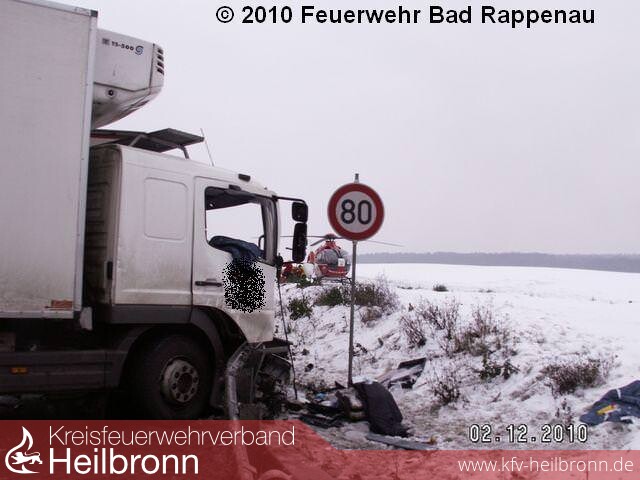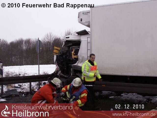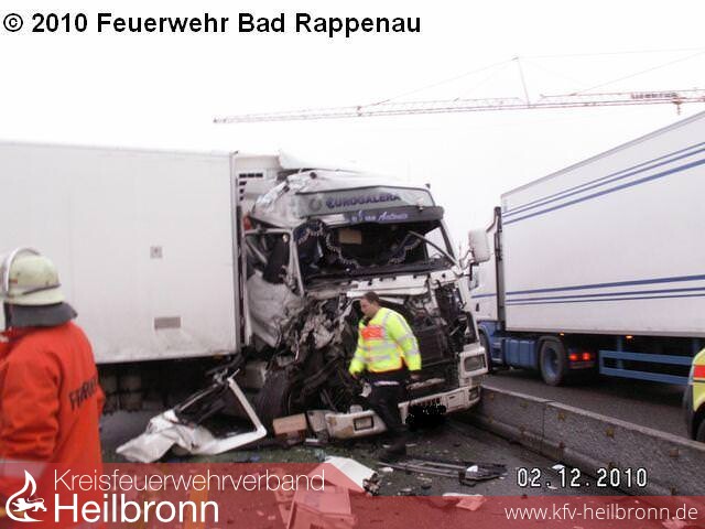Am 02.12.2010 erfolgte um 15:03 Uhr für die Feuerwehr Bad Rappenau, Abt. Bad Rappenau mit dem Alarmstichwort „VU-LKW auf BAB A6 – Kilometer 620“ der nächste Einsatz. Die Einsatzstelle befand sich auf der BAB A6 in Fahrtrichtung Heilbronn. Die gem. Einsatzplan zuständige Feuerwehr Sinsheim konnte aufgrund des sich durch den Unfall bereits gebildeten Stau´s nicht zur Einsatzstelle anfahren. Gemäß dem bestehenden Alarmplan wird in solchen Fällen die Feuerwehr Bad Rappenau hinzu- bzw. mitalarmiert. Nachdem durch die Leitstelle für die Gegenfahrbahn freie Strecke gemeldet wurde fuhren die Fahrzeuge TLF, RW und GW-VS als „Geisterfahrer“ auf der Gegenfahrbahn zur Unfallstelle an. Der Kommandowagen der Feuerwehr Sinsheim war bereits an der Einsatzstelle da er über einen Feldweg angefahren war, was jedoch für die schweren Einsatzfahrzeuge nicht möglich war. Der Fahrer eines verunfallten LKW war zu dieser Zeit noch eingeklemmt, er wurde von den eintreffenden Kräften der Feuerwehr Abt. Bad Rappenau mittels hydraulischem Rettungsgerät aus seinem Führerhaus befreit.