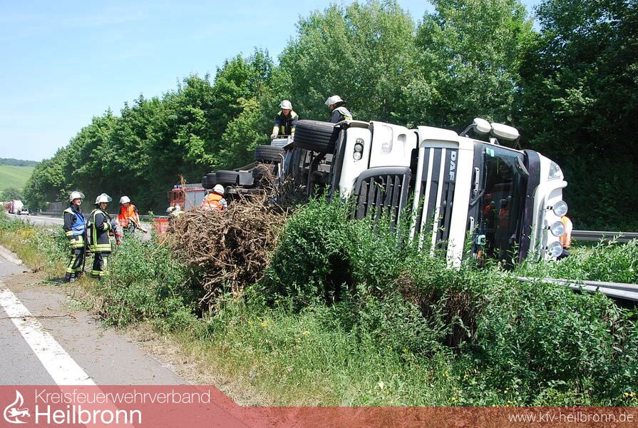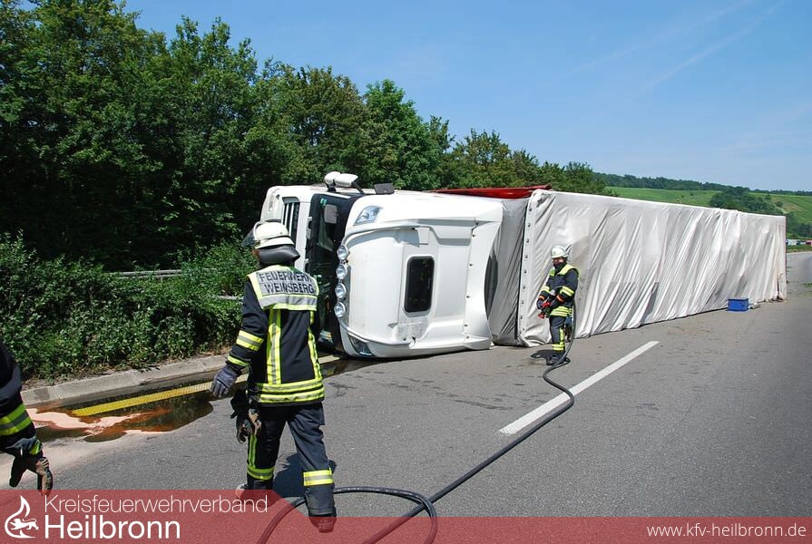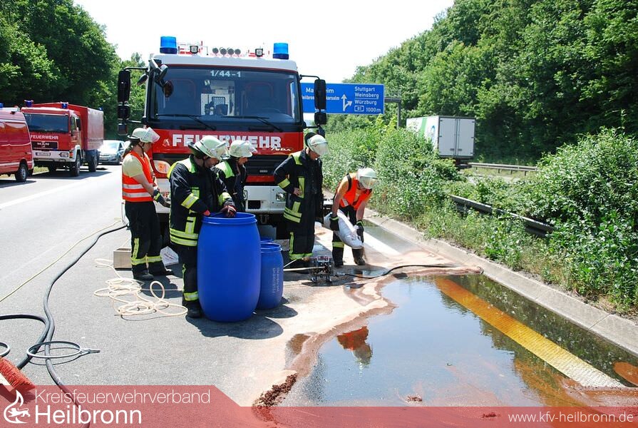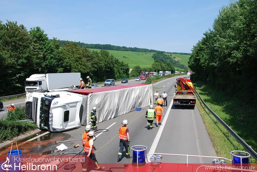 Am frühen Nachmittag wurde die Feuerwehr Weinsberg mit dem Stichwort VerkehrsunfallLKW 1 Person eingeklemmt auf die BAB A6 in Richtung Nürnberg gerufen. An der Einsatzstelle eingetroffen, war ersichtlich, das keine Person mehr eingeklemmt ist. Der Rettungsdienst war bereits vor Ort und kümmerte sich um die verletzte Person. Der LKW war unterwegs in Richtung Mannheim als er durch die Mittelleitplanke brach und auf der Seite zum liegen kam. Dabei wurden die Dieseltanks schwer beschädigt. Es liefen ca. 500l Diesel auf die Fahrbahn. Schachteinläufe wurden gesichert und eingedeicht. Der betroffene Bereich wurde weiträumig mit Bindemittel abgestreut und aufgenommen. Anschließend wurden die beaufschlagten Kanaleinläufe verschlossen und auf Anweisung der unteren Wasserbehörde gespült. Zuletzt wurde das kontaminierte Wasser von einer Spezialfirma aufgenommen und entsorgt. Über die Dauer der Bergungsmaßnahme wurde durchgehend der Brandschutz sichergestellt.