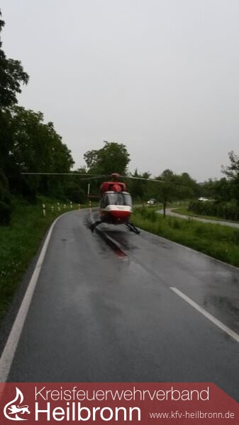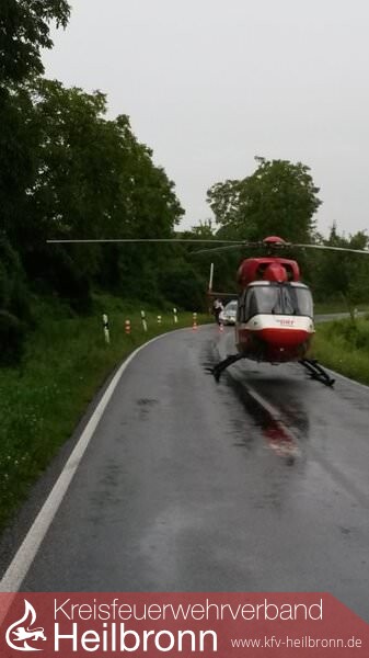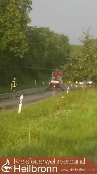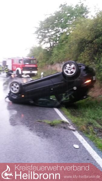 Ein Peugeot lag auf dem Dach am Straßenrand. Er fuhr vermutlich die Böschung am rechten Fahrbahnrand hinauf und überschlug sich infolge dessen. Der Fahrzeuglenker konnte sich selbst aus seinem Fahrzeug befreien. Die ebenfalls alarmierte Feuerwehr Lauffen konnte daraufhin kurz nach ihrem Eintreffen wieder abrücken. Der Fahrer wurde an den Rettungsdienst übergeben. Die Aufgaben der Feuerwehr Talheim beschränkten sich auf die Absperrung der Unfallstelle und der Aufnahme von auslaufenden Betriebsstoffen.