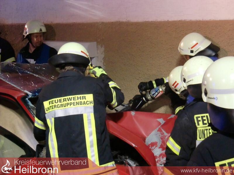 Zu einem schweren Verkehrsunfall in Untergruppenbach-Unterheinriet wurden Feuerwehr, Rettungskräfte und Polizei am frühen Dienstag gerufen. Die 28-jährige Fahrerin eines Peugeot befuhr gegen 2.15 Uhr die Abstatter Straße von Untergruppenbach kommend. Aus bislang ungeklärter Ursache verlor sie in einer Rechtskurve die Kontrolle über ihr Fahrzeug, überfuhr einen Lichtmast und prallte im Anschluss gegen eine Gebäudewand. Die eingeklemmte Frau musst von der Freiwilligen Feuerwehr Untergruppenbach, die mit 30 Einsatzkräften im Einsatz war, aus dem Fahrzeug befreit werden. Glücklicherweise erlitt die Frau zwar nur leichte Verletzungen, wurde aber dennoch vorsorglich mit dem Rettungswagen in ein Krankenhaus gebracht. Die Höhe des entstandenen Sachschadens kann bislang noch nicht beziffert werden