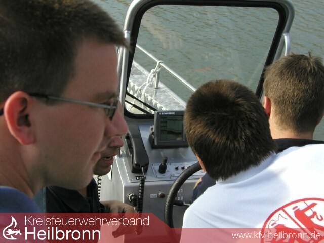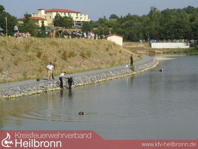 Ebenfalls alarmierte die Rettungsleitstelle Heilbronn die Rettungstaucher der DLRG von Lauffen und Leingarten. Um ca. 16.50 Uhr waren bereits die ersten Rettungstaucher der BF Heilbronn im Wasser. Mit einer systematischen Suchaktion suchte man ein Gebiet von fast 100 auf 100 Meter ab. Nach und nach trafen alle Einsatzkräfte ein und in kurzer Zeit hatte man 8 Taucher im Einsatz. Darunter Vier der Berufsfeuerwehr Heilbronn, Drei vom DLRG und einen Taucher der Wasserschutzpolizei. Zeitweise war auch ein Polizeihubschrauber im Einsatz, der die Einsatzstelle überflog - jedoch ebenfalls ohne Erfolg. Einsatzleiter der BF Heilbronn Eberhard Jochim beorderte zusätzlich das neue Mehrzweckboot zur Einsatzstelle. Mit dem Echolot des Mehrzweckbootes wurde der Grund des Sees abgetastet.