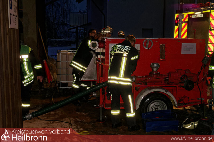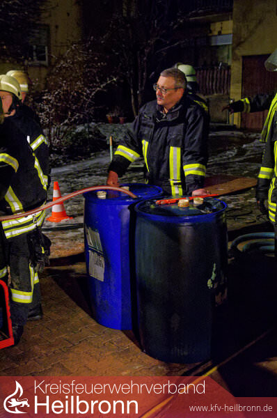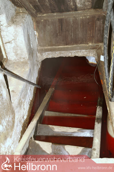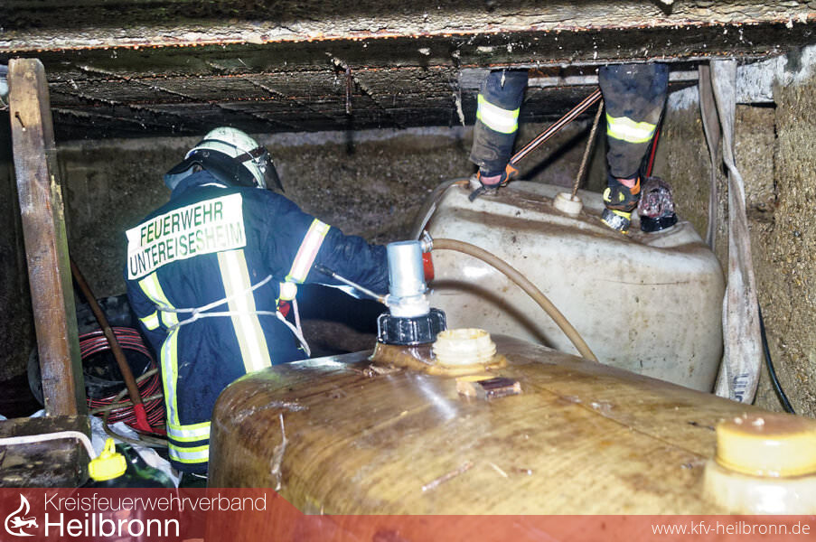 Vor Ort stellte sich heraus, dass durch einen Wasserrohrbruch mehrere Kellerräume geflutet wurden. In einem dieser Räume befanden sich 2 Öltanks, die sich gelöst hatten und ausgelaufen sind. Mit Hilfe des Ölsanimats der Berufsfeuerwehr Heilbronn konnte das ausgelaufene Heizöl (ca. 1200 l) aufgesogen und anschließend die Kellerräume leergepumt werden.