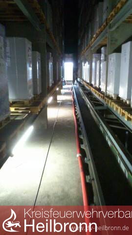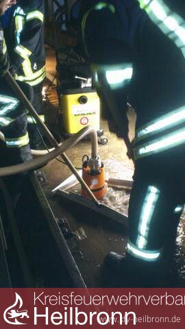 Es drohte Gefahr durch Überflutung der Stromschiene am Boden und die Zerstörung der eingelagerten Waren. Mit Wassersauger und Vakuumpumpe wurde das Wasser auf ein erträgliches Mass gesenkt und hinaus gepumpt.