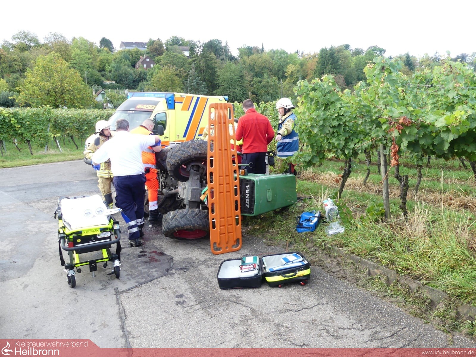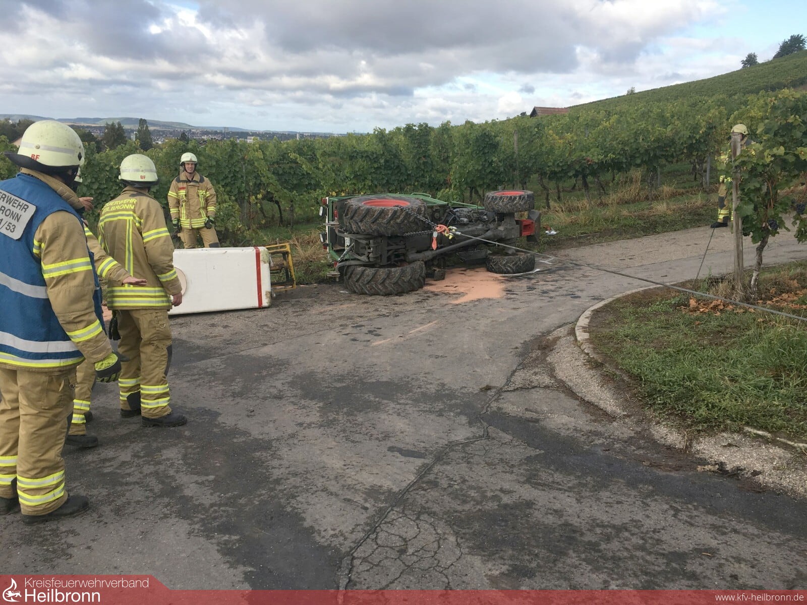 Kurz nach 09.00 Uhr wurde die Feuerwehr in die Heilbronner Weinberge gerufen. Dort war ein Weinbergschlepper im Kurvenbereich eines Feldweges umgekippt. Da die Fahrerin vor Ort über starke Rückenschmerzen klagte, musste eine patientengerechte Rettung in Absprache mit dem Notarzt durchgeführt werden. Während die Patientin medizinisch versorgt wurde, entfernte die Feuerwehr Fensterscheiben und Anbauteile an dem Schlepper. Hierdurch konnte eine ausreichende Rettungsöffnung zum schonenden Transport der jungen Frau geschaffen werden.