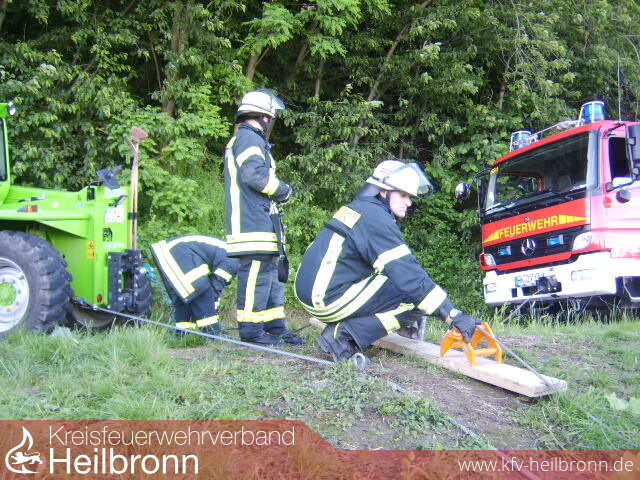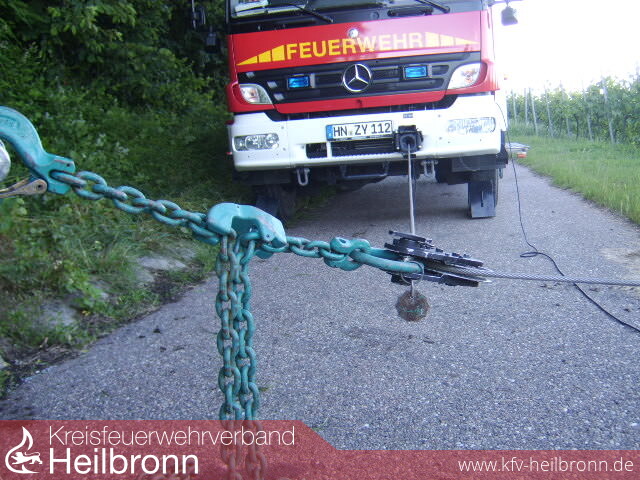 Zur Bergung des Unfallfahrzeuges wurde von der Einsatzleitung die Freiwillige Feuerwehr Lauffen mit Rüstwagen und die Berufsfeuerwehr Heilbronn mit dem Feuerwehrkran nachgefordert. Schlussendlich wurde der Schlepper mit Hilfe der Rüstwagen-Seilwinde und dem Bauhof-Radlader den Berg hinaufgezogen, da sich der Kran wegen der Topographie nicht sinnvoll aufstellen ließ.