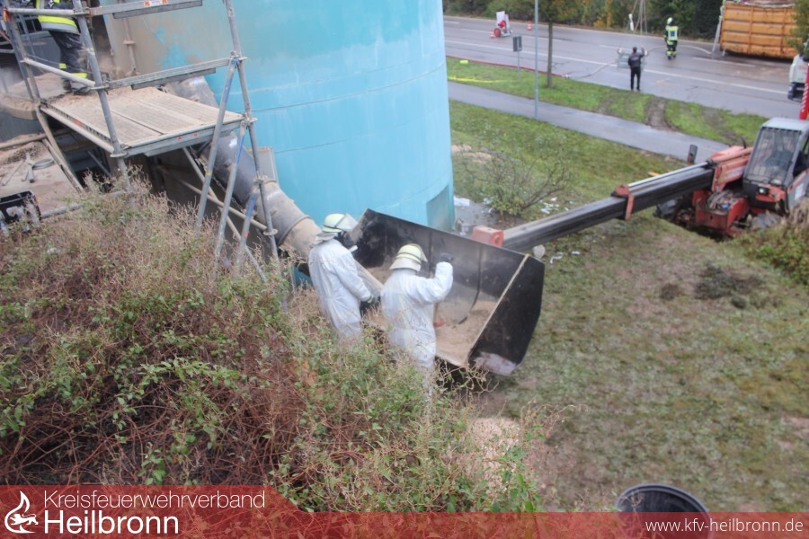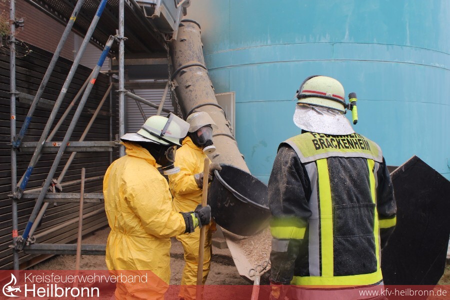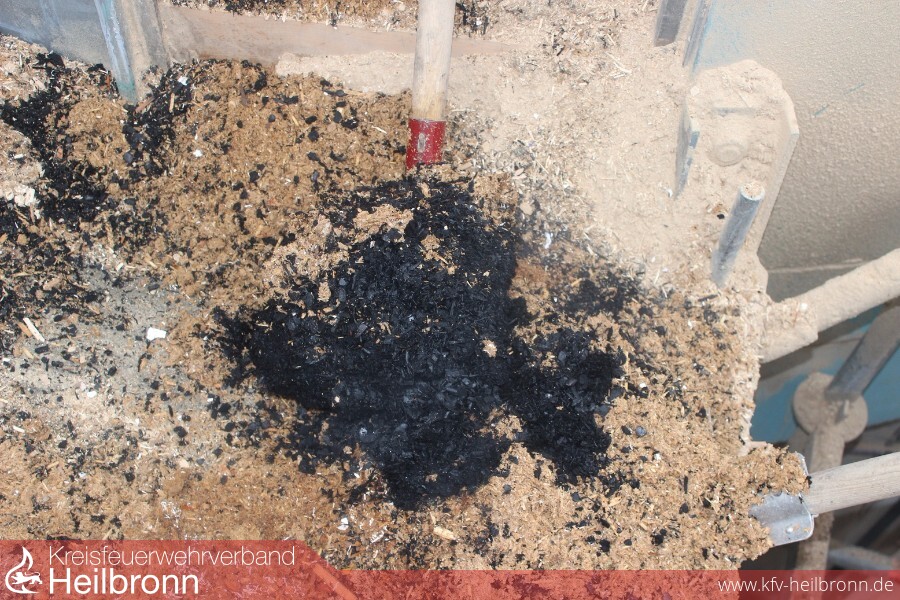 Nach Eintreffen an der Einsatzstelle konnte noch eine Rauchentwicklung am Silo festgestellt werden. Mittels Drehleiter wurde von oben ein Blick in das Silo geworfen. Da weitere Glutnester im Inneren des Silos vermutet wurden, entschloss sich der Einsatzleiter das gesamte Silo entleeren zu lassen.