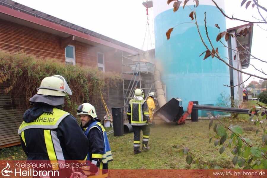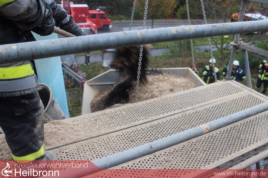 Zunächst wurde von der Feuerwehr versucht ein Fachunternehmen zur Entleerung des Silos zu kontaktieren. Nach Auskunft des Fachunternehmens konnte dieses aufgrund der vermuteten Glutnester aber nicht tätig werden. Nachdem an der Wartungsöffnung des Silos von einem Gerüstbauunternehmen ein Arbeitsgerüst gestellt wurde, ein Container für die auszuräumenden Späne angeliefert sowie ein mobiler Kran eines Zimmererunternehmens und ein Teleskopradlader eines örtlichen Landwirtes organisiert waren, wurde um kurz nach 13:00 Uhr durch die Feuerwehr mit dem Entleeren des Silos begonnen. Nach mehr als fünf Stunden konnte gegen halb sieben am Abend ein leeres Silo gemeldet werden, bevor der Einsatz gegen 21:00 Uhr am Abend nach länger andauernden Aufräumarbeiten beendet werden konnte.