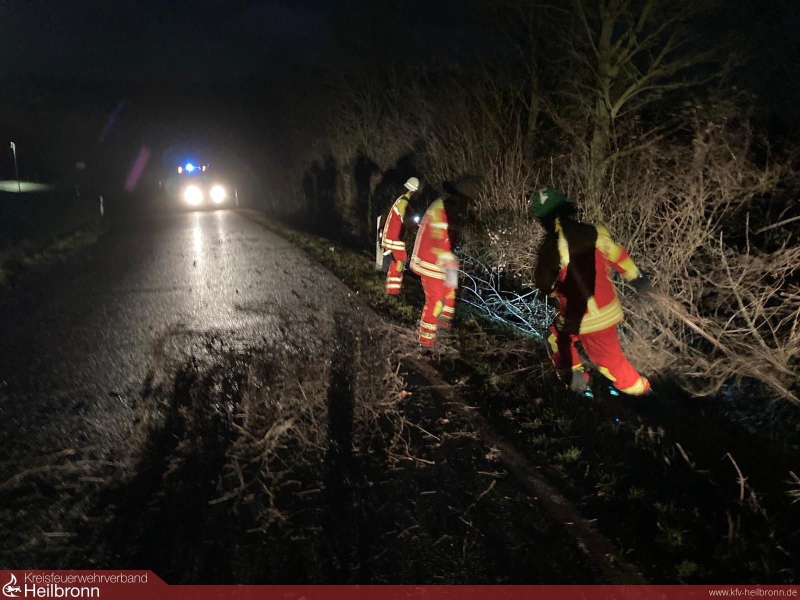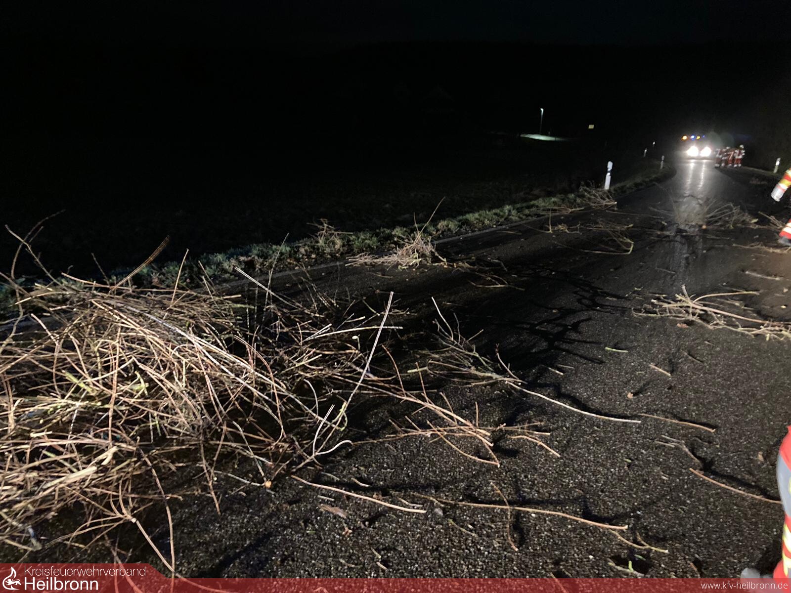 Vor Ort wurde kein umgestürzter Baum aufgefunden sondern Schnittgut von eingen Sträuchern und Hecken, dass durch den Sturm auf die Straße geweht wurde.