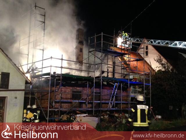 Notrufer meldeten dem Polizeipräsisium Heilbronn gegen 02.30 Uhr, dass in Zaberfeld, Ecke Schillerstraße / Häfnerhaslacher Straße ein Dachstuhl brennen würde. Bei Eintreffen der ersten Streifenwagen brannte das Gebäude jedoch lichterloh. Es konnte festgestellt werden, dass sich noch ein Baugerüst um das Objekt befand. Die angrenzende Scheune fing ebenfalls Feuer. Die umliegenden Wohngebäude wurden von der Feuerwehr evakuiert. Die Brandursache ist bislang völlig unklar, noch geht die Polizei davon aus, dass sich niemand im Gebäude befand. Sobald weitere Erkenntnisse vorliegen wird nachberichtet.