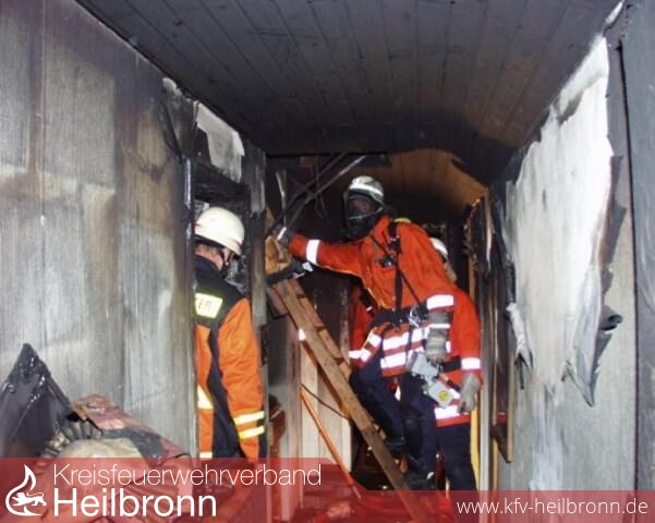 Ein weiteres C-Rohr wurde über die Drehleiter vorgenommen. Sehr große Mengen des Brandschuttes wurden unter Hilfe von zwei Schuttcontainern und dem Kranwagen der BF Heilbronn entsorgt. Nur so war eine abschließende Brandbekämpfung möglich.Ein Zimmer der Dachwohnung ist vollständig ausgebrannt.