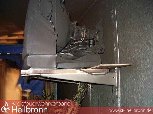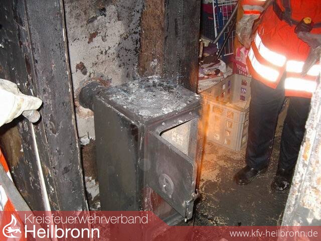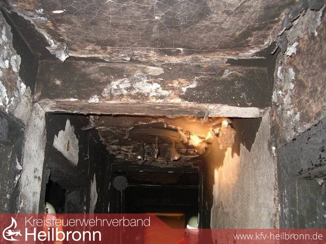 Ein zweiter Atemschutztrupp ging noch in das Gebäude, um den Holzofen mit abzubauen und in das Freie zu verbringen. Anschließend wurde das Gebäude belüftet um eine ordentliche Erkundung durchzuführen. Dabei stellte sich heraus, dass eine Durchzündung stattgefunden haben musste.Das komplette Dachgeschoß war durch die Stichflammen in Brand gesetzt worden. Sämtliche Kunststoffteile sind abgebrannt und zerschmolzen.Die Türrahmen und Türblätter hatten Feuer gefangen.Ebenso hatten sich im Bereich, über dem Ofen, in der Decke Glutnester gebildet. Die Decke wurde aufgebrochen und der komplette Spitzgiebel wurde kontrolliert.