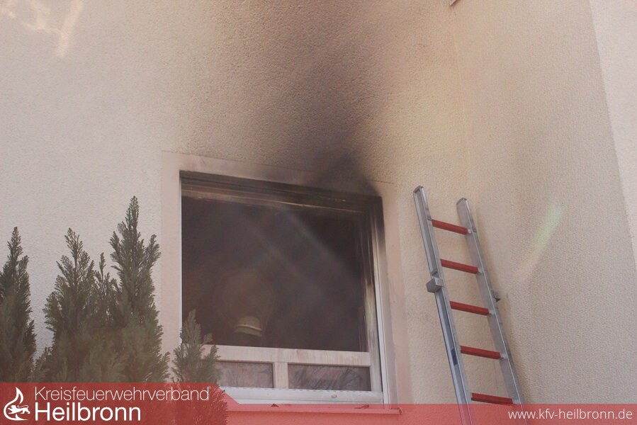 Ein Trupp unter Atemschutz ging mit einem C-Rohr über die Steckleiter zur Brandbekämpfung vor. Ein weiterer Trupp unter Atemschutz stieg mit dem zweiten C-Rohr und Rauchvorhang über das Badfenster in die Wohnung ein. Da alle Zimmertüren der Wohnung offen standen, konnte die Rauchausbreitung aber nicht mehr verhindert werden. Aufgrund der nicht ausreichenden Wasserversorgung in der Stichstraße des Einsatzortes wurde von der Besatzung des TLF aus Brackenheim eine Wasserversorgung von einer Ringleitung des Hydrantennetzes aufgebaut.